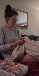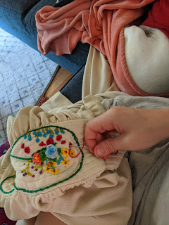 What commenced was 3 straight days of embroidery, where I sewed, scrapped, and resewed a bunch of different shapes in hope that they resembled flowers. I would say if you’re going to do this, just don’t overthink it. Use whatever colors you want, even if you don’t think they’ll match. I believe that anything you like won’t clash with anything else you like, because YOU like it. Makes sense, right?
