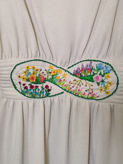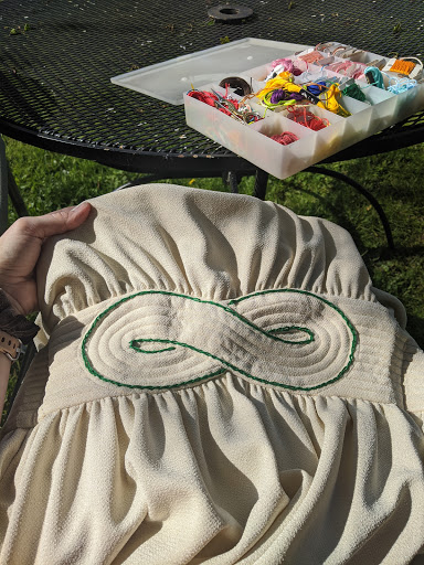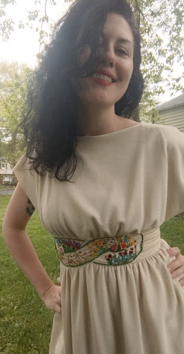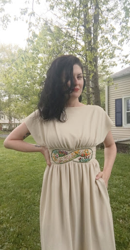 I started refashioning this dress by addressing it’s lack of color. Since this dress is polyester, and polyester doesn’t take dye well, it would forever be beige. Polyester is made from plastic, which is dyed in it’s melted liquid form, before being extruded through essentially a big a** pasta maker. If you don’t dye it while it’s molten, the best you could do is buy a synthetic dye that will basically stain the outside of the threads, but never penetrate it (see, that degree comes in handy sometimes, haha). Er go, I decided to bust out my embroidery floss!