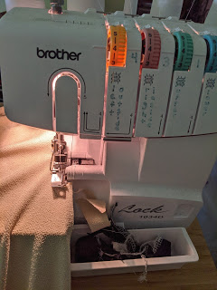I laid the dress so the shoulders were touching, lined up the button placket, and just eyeballed a scoop! Even though this fabric was a knit polyester that wasn’t going to unravel, I still wanted a clean seam, so she took a trip under the serger.