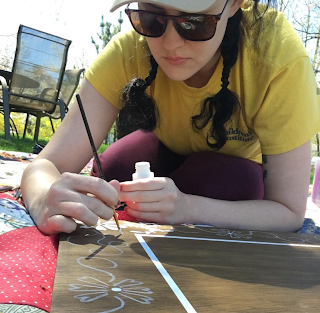 Once the stain had set overnight, it was time to paint the details! Full discloser, I messed up the first time, so I had to flip it over and stain the back so it would be the new front. Accidents happen, but in the long run, they’re not as big as deal as you (or I) think.