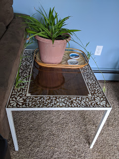 Here’s my lovely table in my den, doing what a table oughta do, by holding up a spider plant my neighbor gave me, a serving tray I got from Goodwill a while back, and two coasters that I found in a garbage pile, cleaned up, and painted. And the laissez-faire approach to painting turned out much better than I expected!