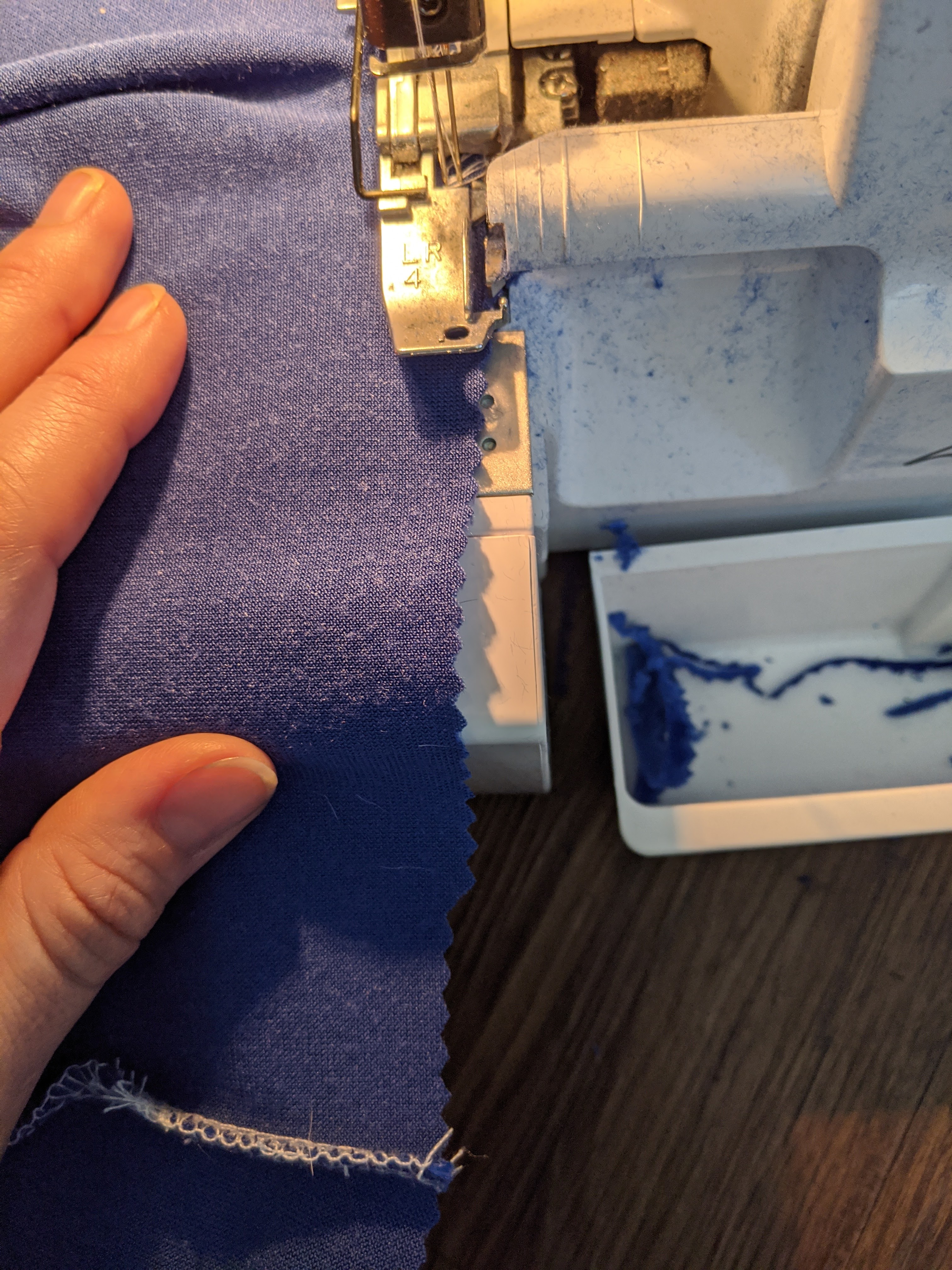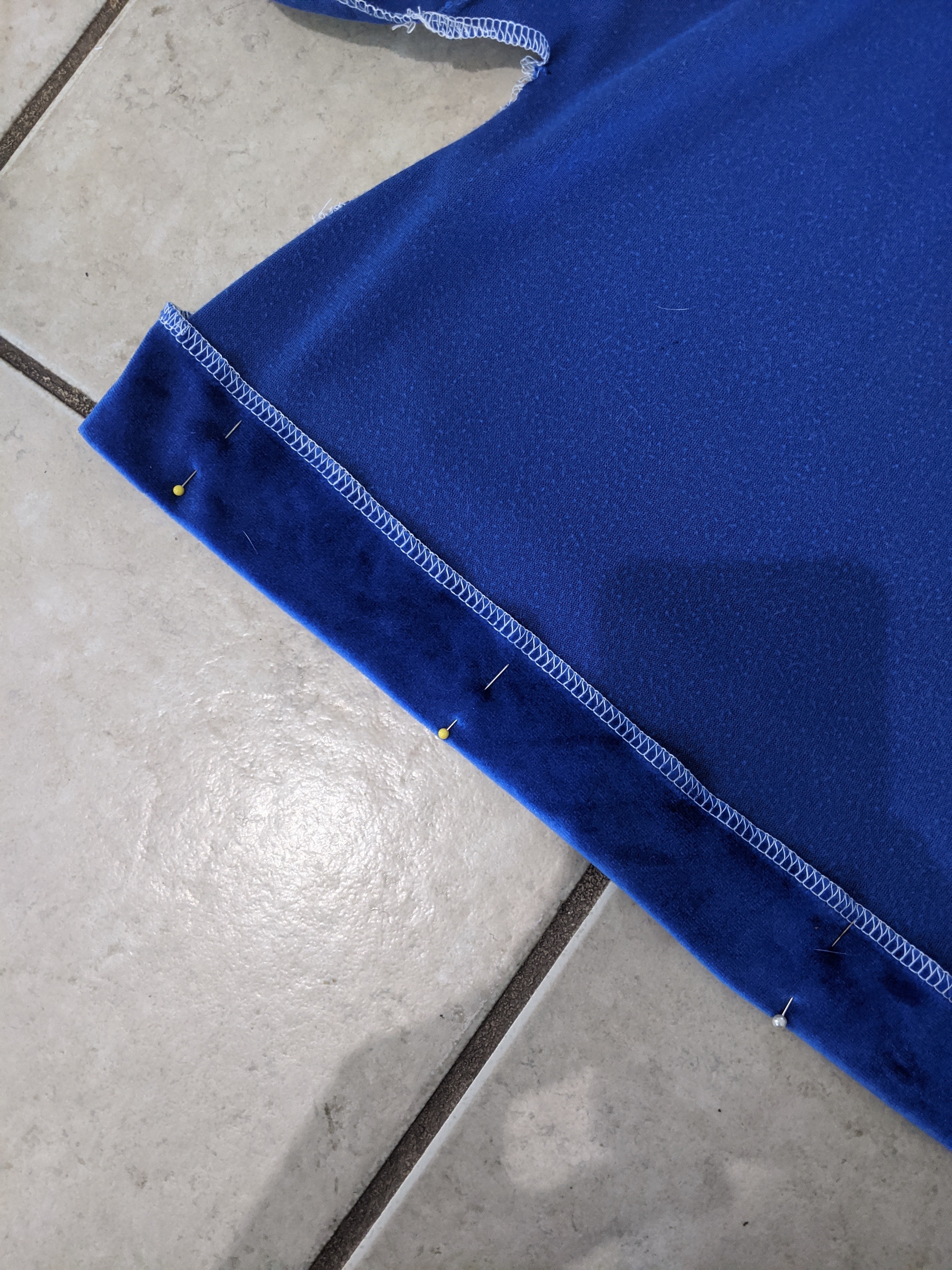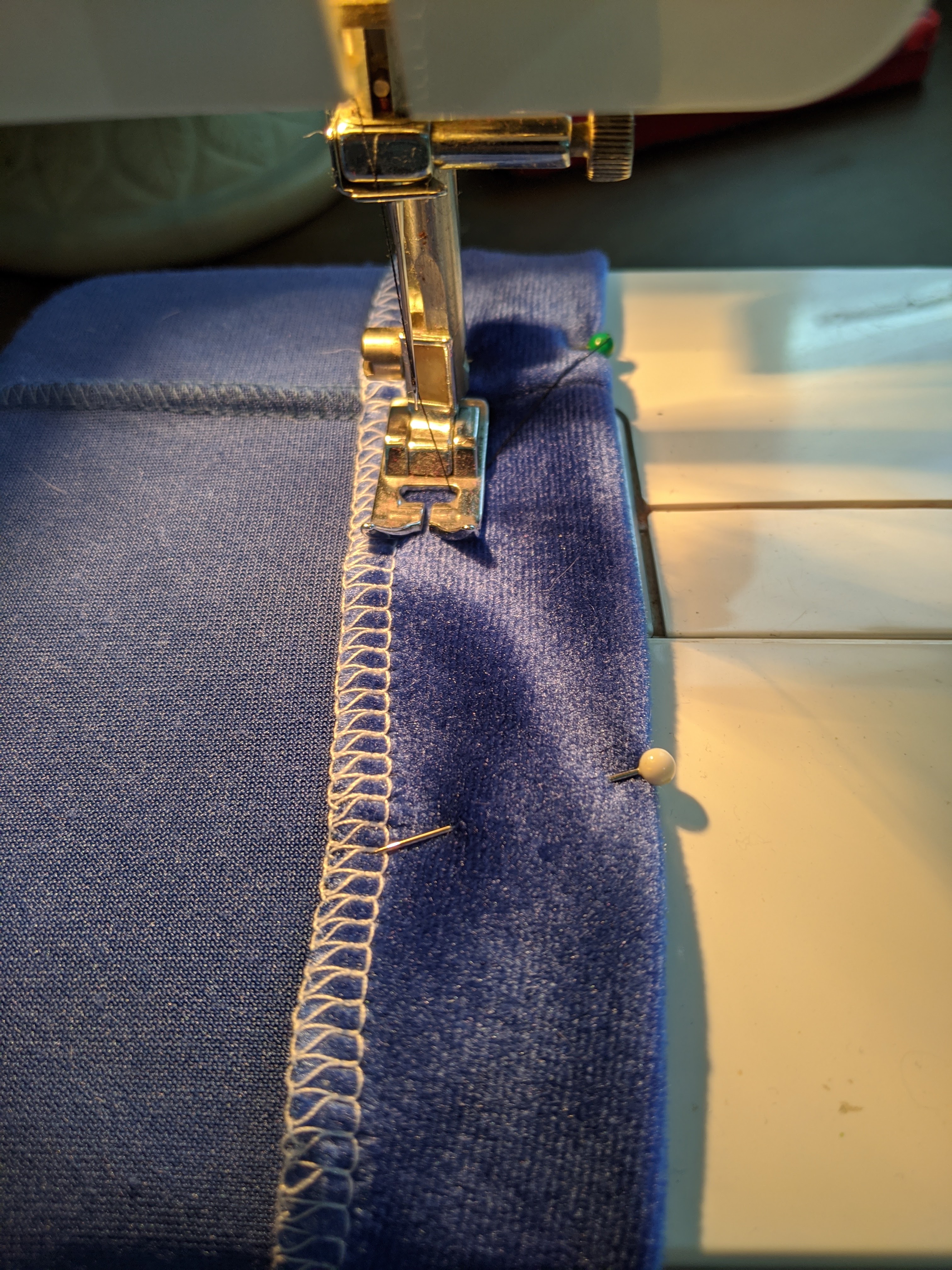 Since velvet likes to get dusty fluff everywhere when cut, I decided to serge the seams rather than trim and sew them. That would keep the fluff level down, and seal the raw edges.