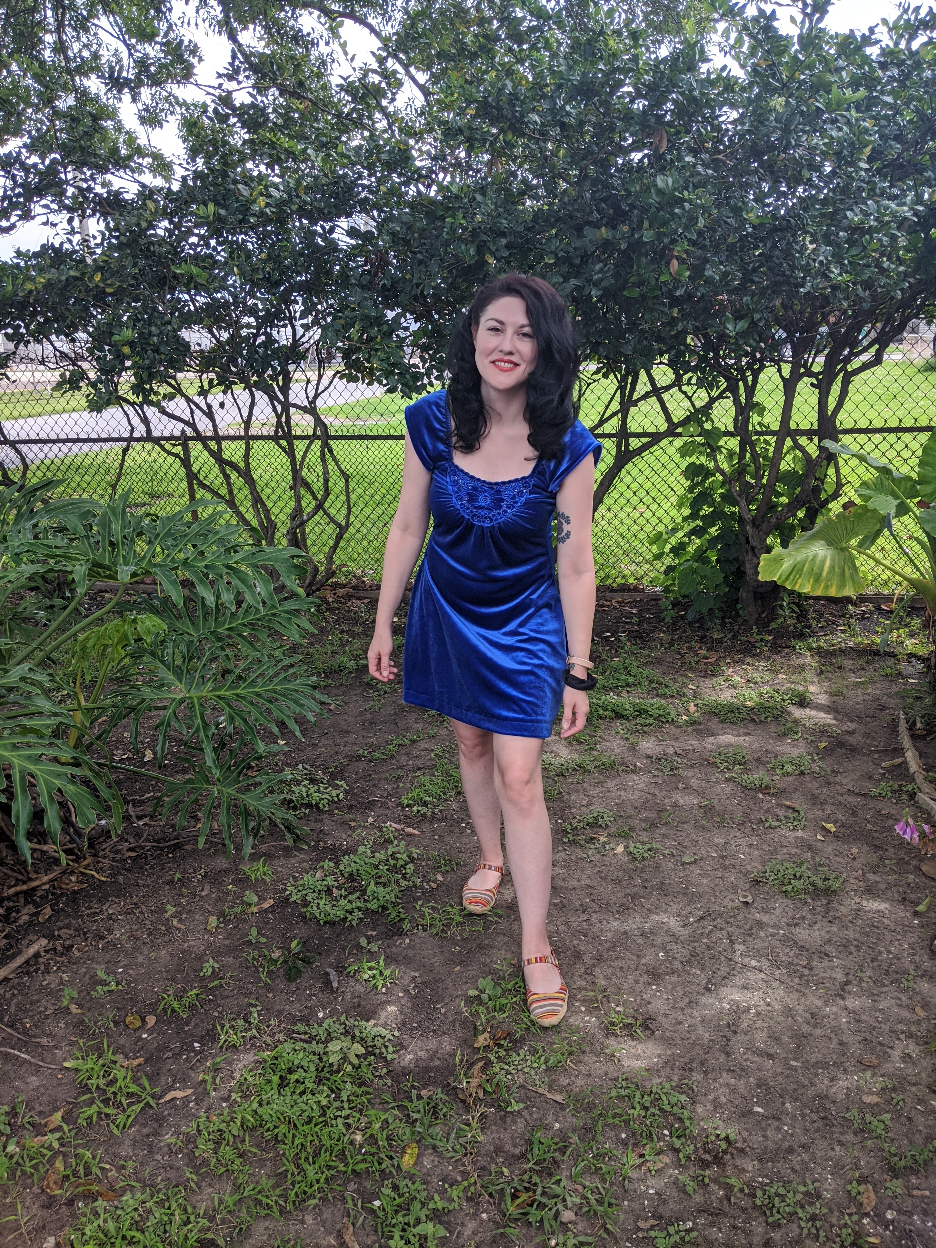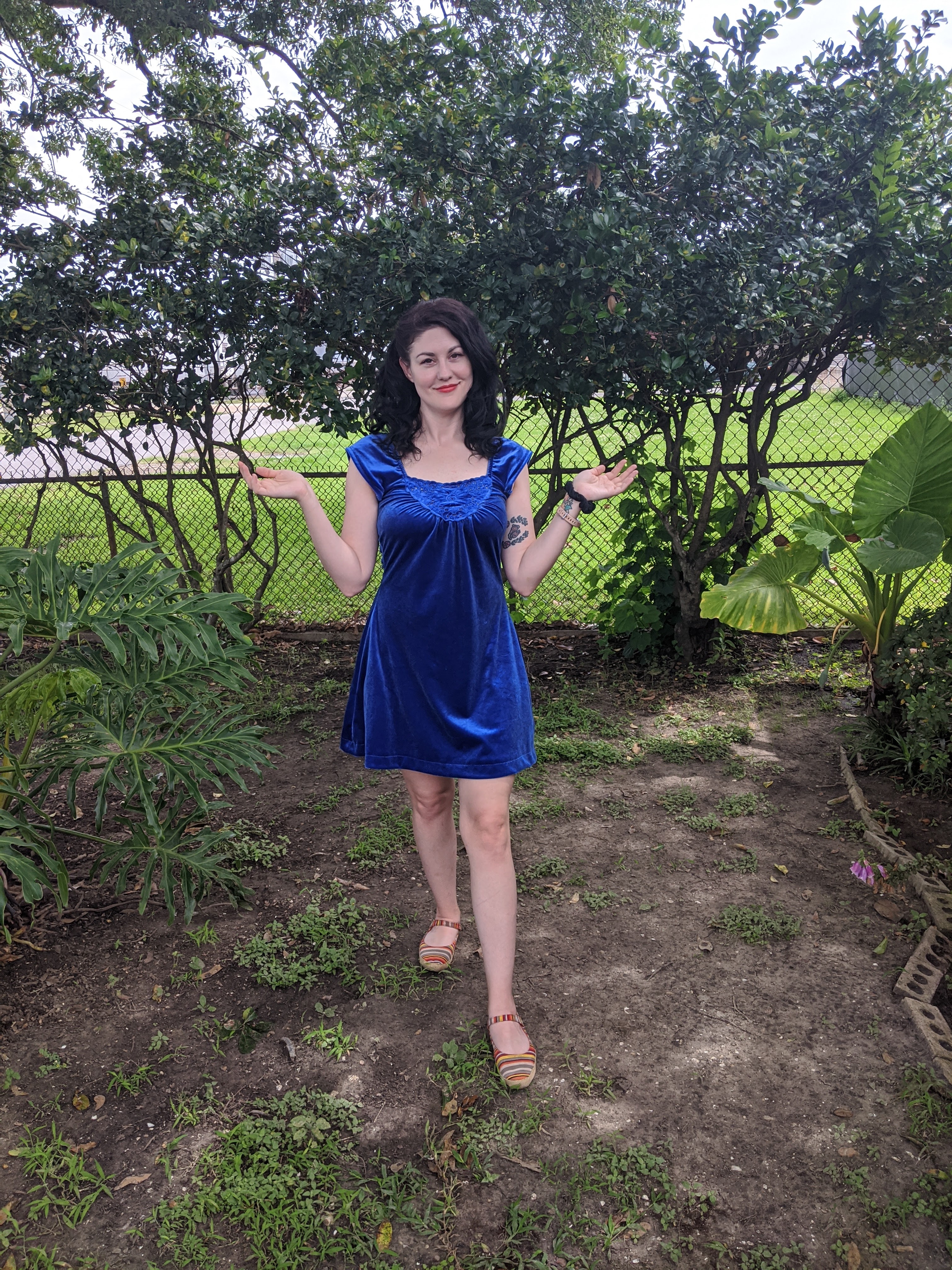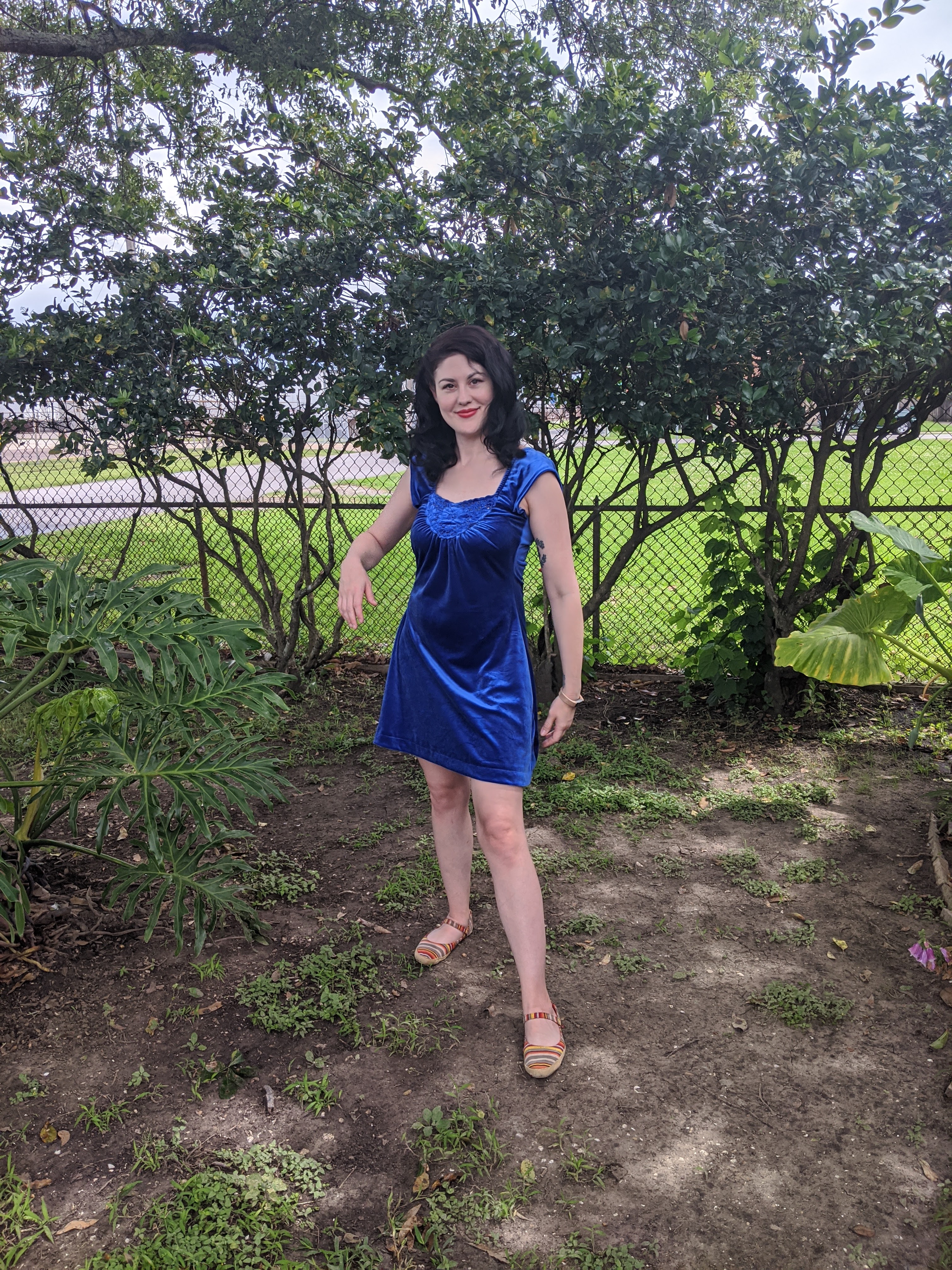 I only wore this dress to the yard because I didn’t want to wear blue to the Black Lives Matter protest in New Orleans, for obvious reasons. If this dress weren’t polyester, I would have dyed it a plum color. I changed right out of it and went down town to the march, because I feel very strongly that if white people are the problem, white people are the answer, and that means I need to step up and do better for the black community. So! Support black artists, authors, podcasters, politicians, business owners, and laws/policies that create a more just world for them. This is not a political issue, it’s a human rights issue, and that’s all of our problem. I submit this poem by Martin Niemoller to illustrate that point: