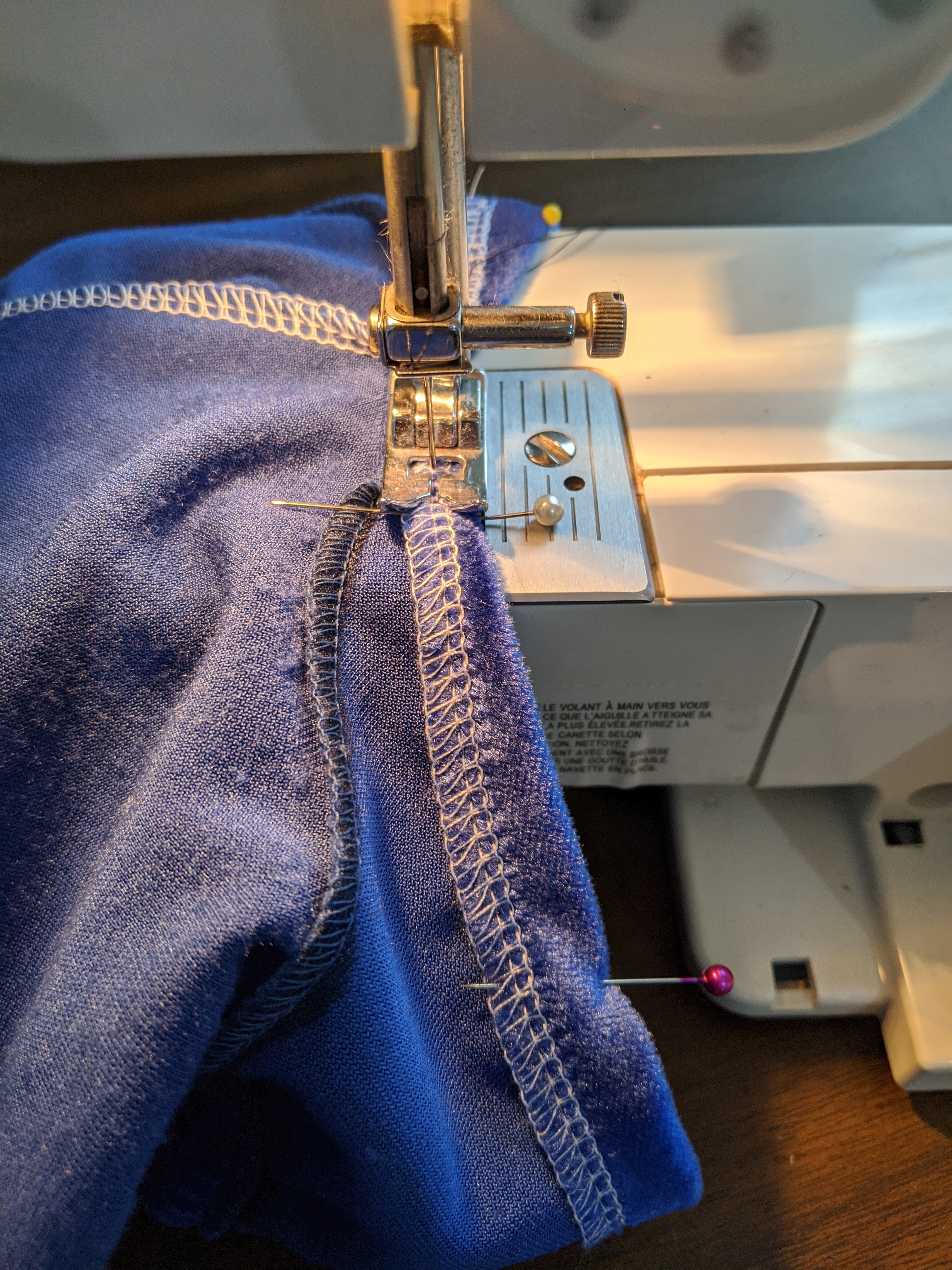 Then I serged the sleeve openings, which I didn’t manage to get a picture of, but you get the idea. Once they were serged, I turned the seam towards the wrong side of the fabric and stitched it down (so that you can’t see the white serger thread). I tend to only thread my serger with only white or black thread, because it’s such a pain to change it, so that’s why my serged seams never match the fabric! I don’t think it matters though, because it’s on the inside anyway.