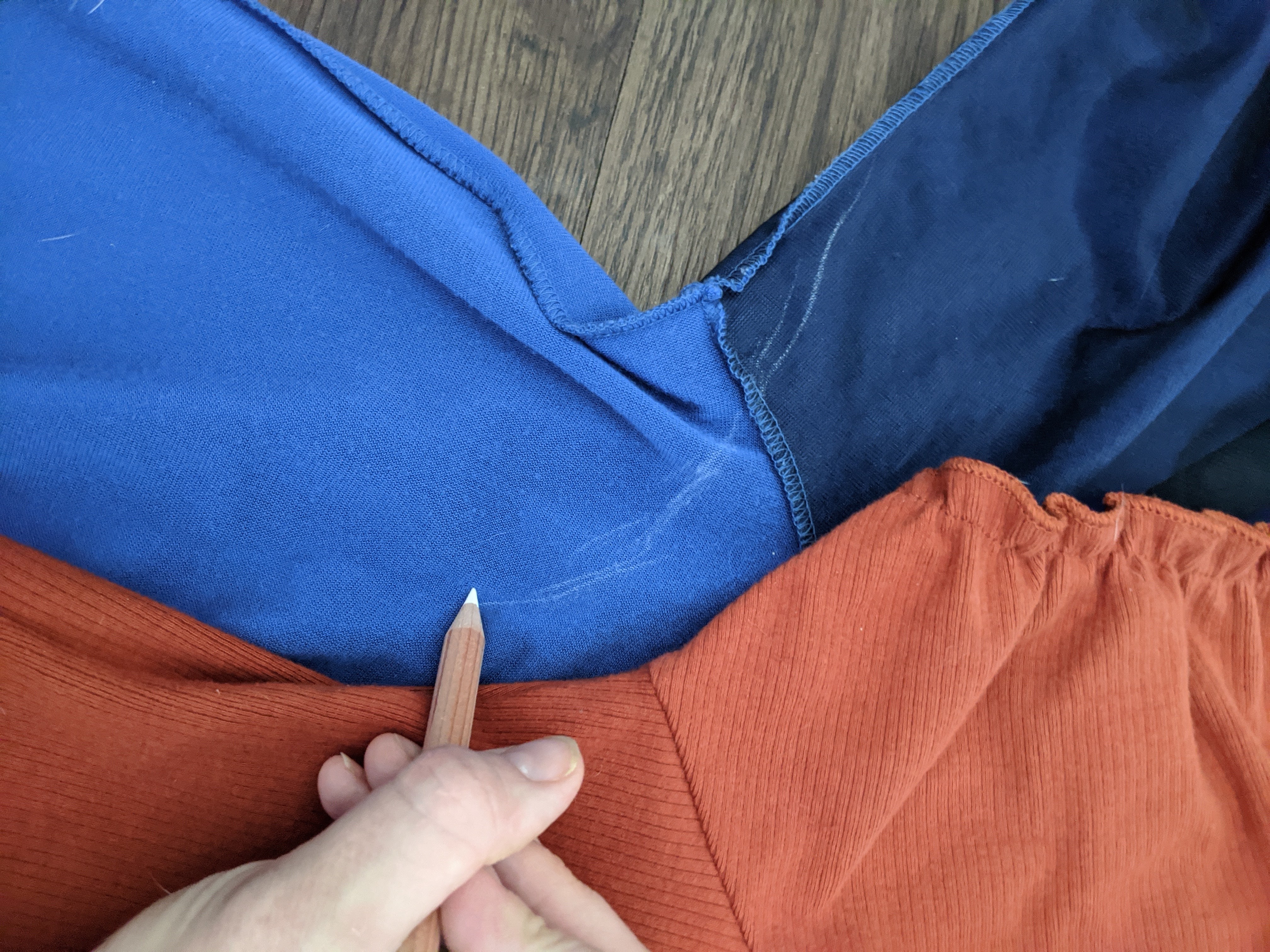 Then I started outlining the fitted dress onto the blue dress with a chalk pencil. You can see I left some room around the fitted dress for seam allowance. Also, the blue dress doesn’t have much stretch to it, and I didn’t want to put in a zipper, so I needed some wiggle room.