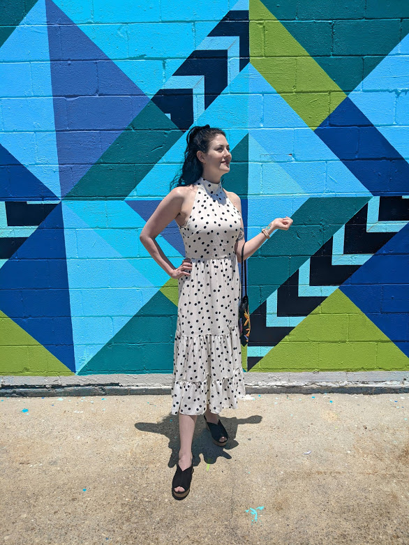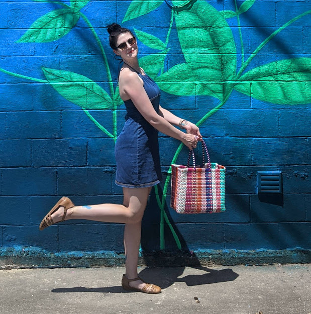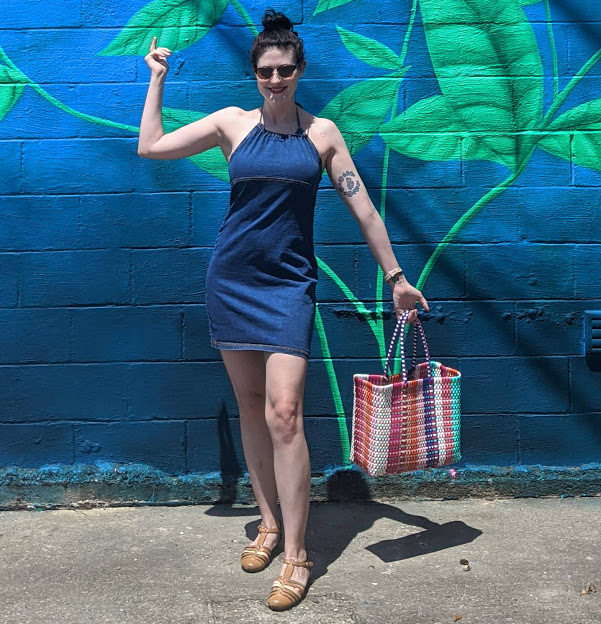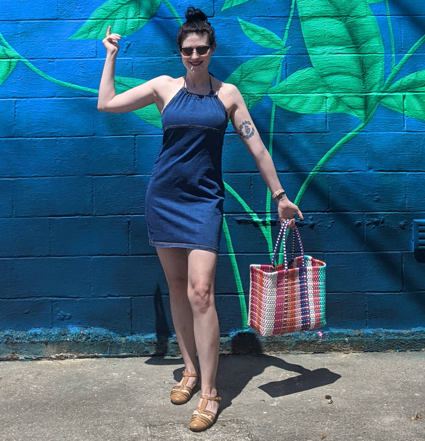 This next dress is just a simple denim halter dress, but it fits LIKE A GLOVE and you can accessorize it so many ways. I know denim dresses instantly conjure memories of kindergarten teachers from the 1990’s (shout-out to Ms. Beamish), but I will defend them to the hilt. They’re just classically American and timeless in my book. It was hanging out in a Goodwill in Rockaway, New Jersey for around $8 (because prices are higher in NJ *eye roll*). I paired it with a thrifted bag from Funky Monkey vintage shop in New Orleans. It was originally made by Maria Victoria, of https://www.mymariavictoria.com/