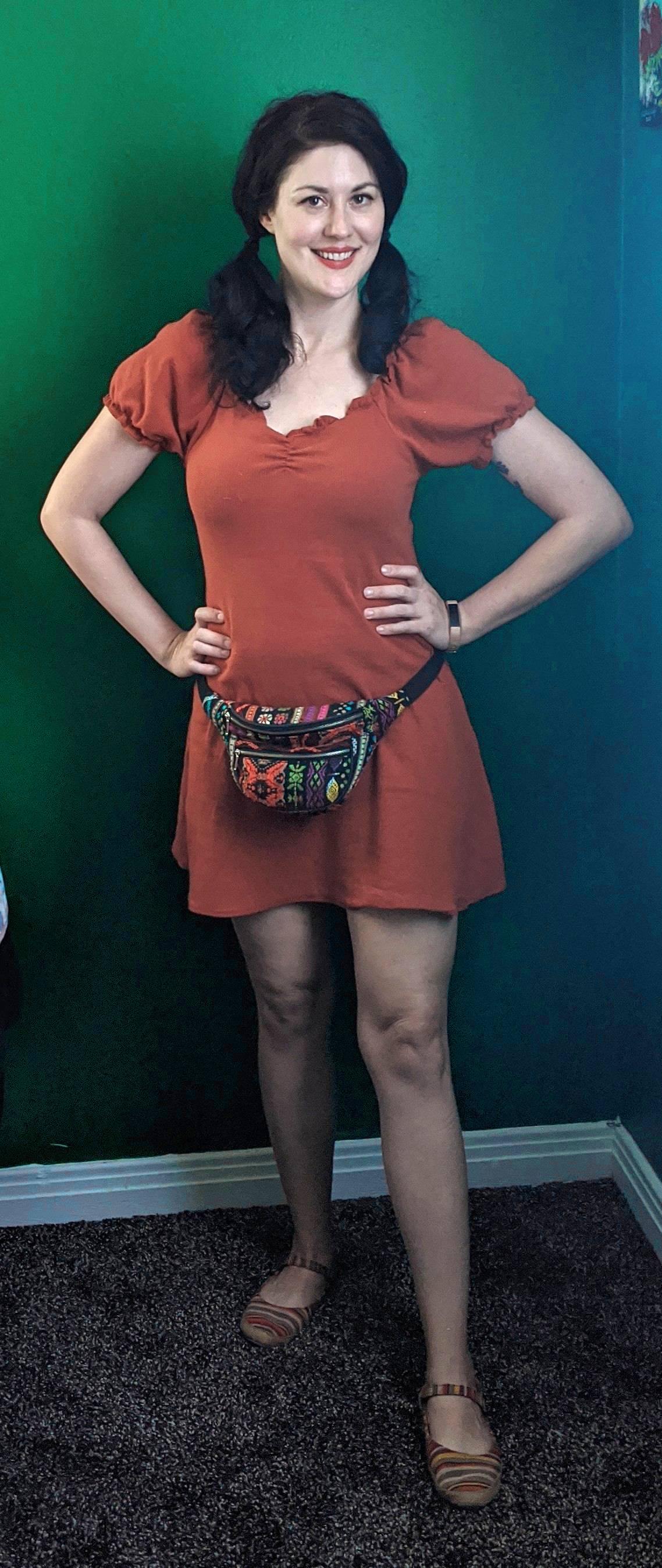 This rust/terracotta dress was found at Buffalo Exchange, a thrift store chain that’s all across the country and has a cooler, more modern vibe for the young bloods. You can see if there’s one in your area here: https://www.buffaloexchange.com/locations/ . I think I paid $12 for this dress because there was a 25% sale going on the day I went. Since New Orleans is only in phase one of reopening shops, we weren’t allowed to try anything on in the fitting rooms. I’m not sure if that makes sense, but it is what it is. Anyway, usually I pick things I think will fit, try them on, and they end up being way too small for me (I have no clue what I look like apparently). This time I took a gamble and was pleasantly surprised! I also found the shoes and fanny pack there, which were $15 and $12, respectively.