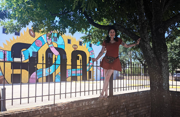My sister/photographer and I couldn’t get right up to the mural behind me because the parking lot was locked, so we made do and I climbed onto the fence. Later when we got home, we saw that these pictures were not as clear as the others, so we also took a picture in her bedroom. Again, make do.