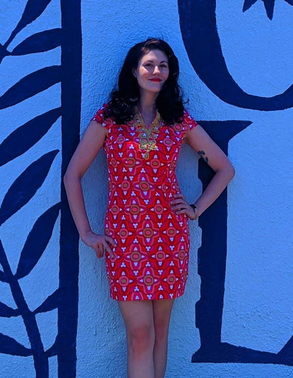 This first dress was found at a Goodwill in New Orleans for $4.99. It’s got the bright, mod vibes reminiscent of my favorite fashion decade, the 1960’s. It also has lovely gold embroidery detailing around the neckline, so bonus!