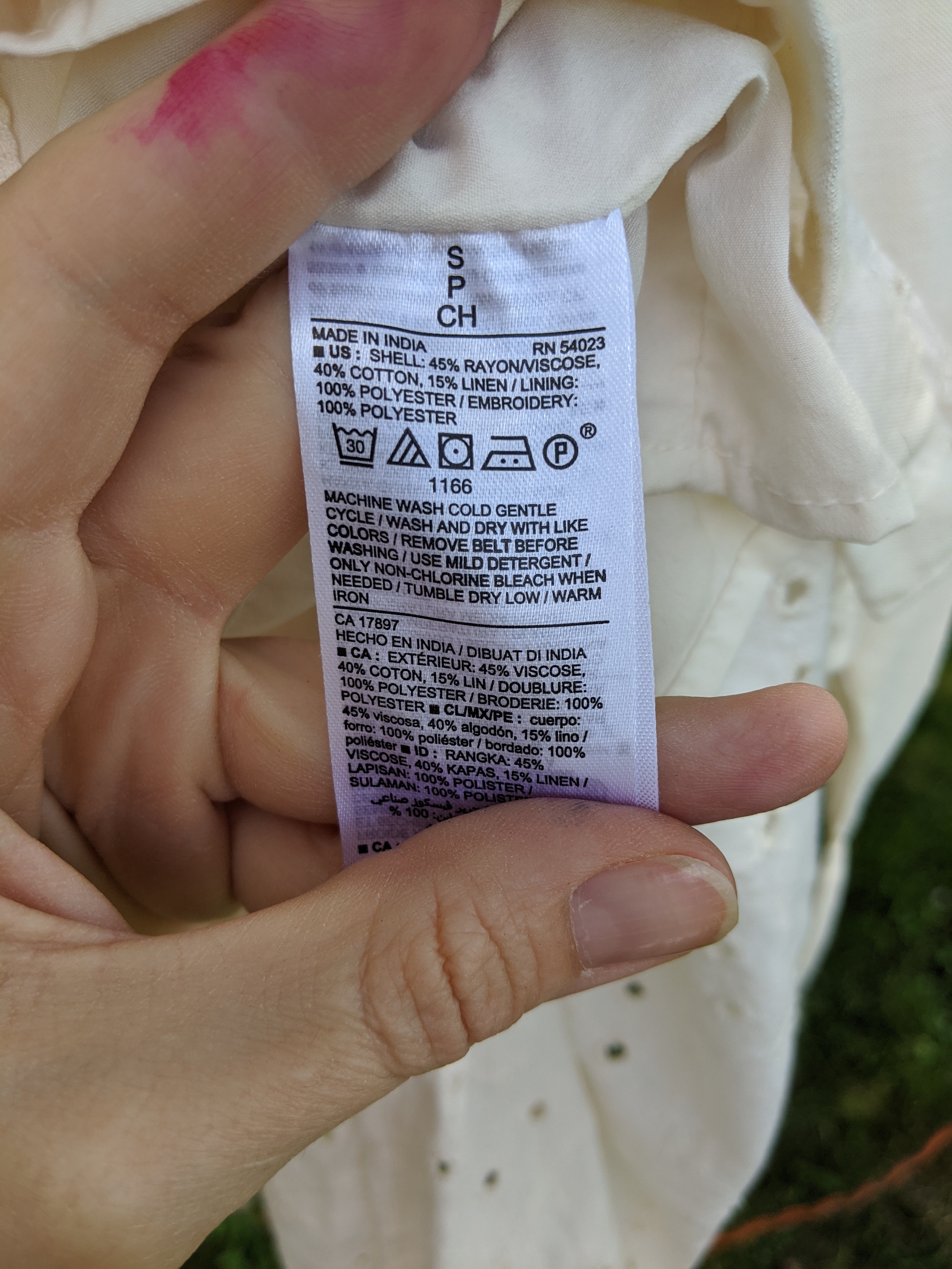 You can see from the tag that the dress is a mélange of materials. In general, natural fibers will absorb dye while synthetic ones won’t. We know cotton and linen are natural, and polyester is synthetic, but what about rayon? Rayon is a funny material, and to quote an article from the Museum Textile Service’s website:
