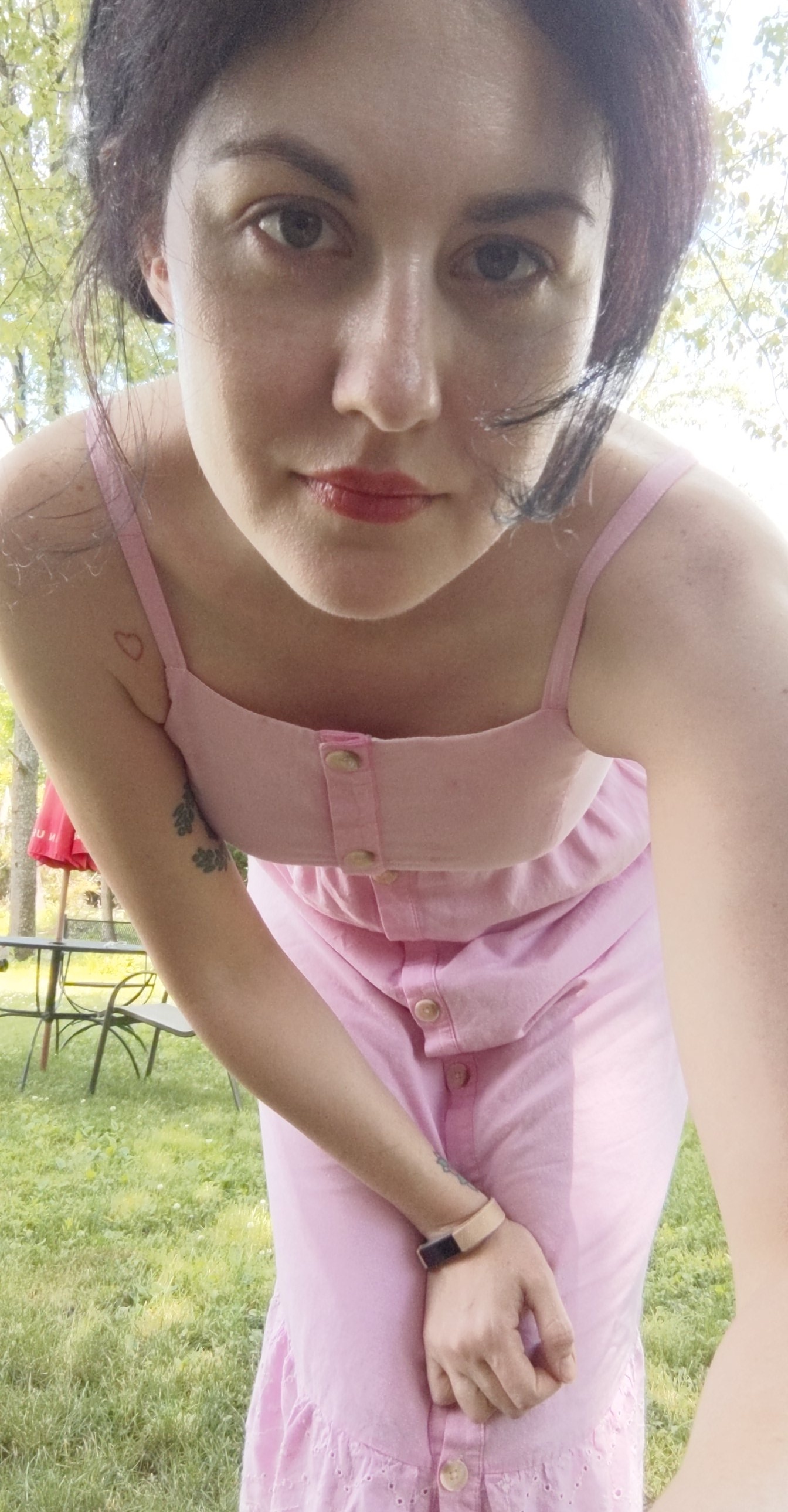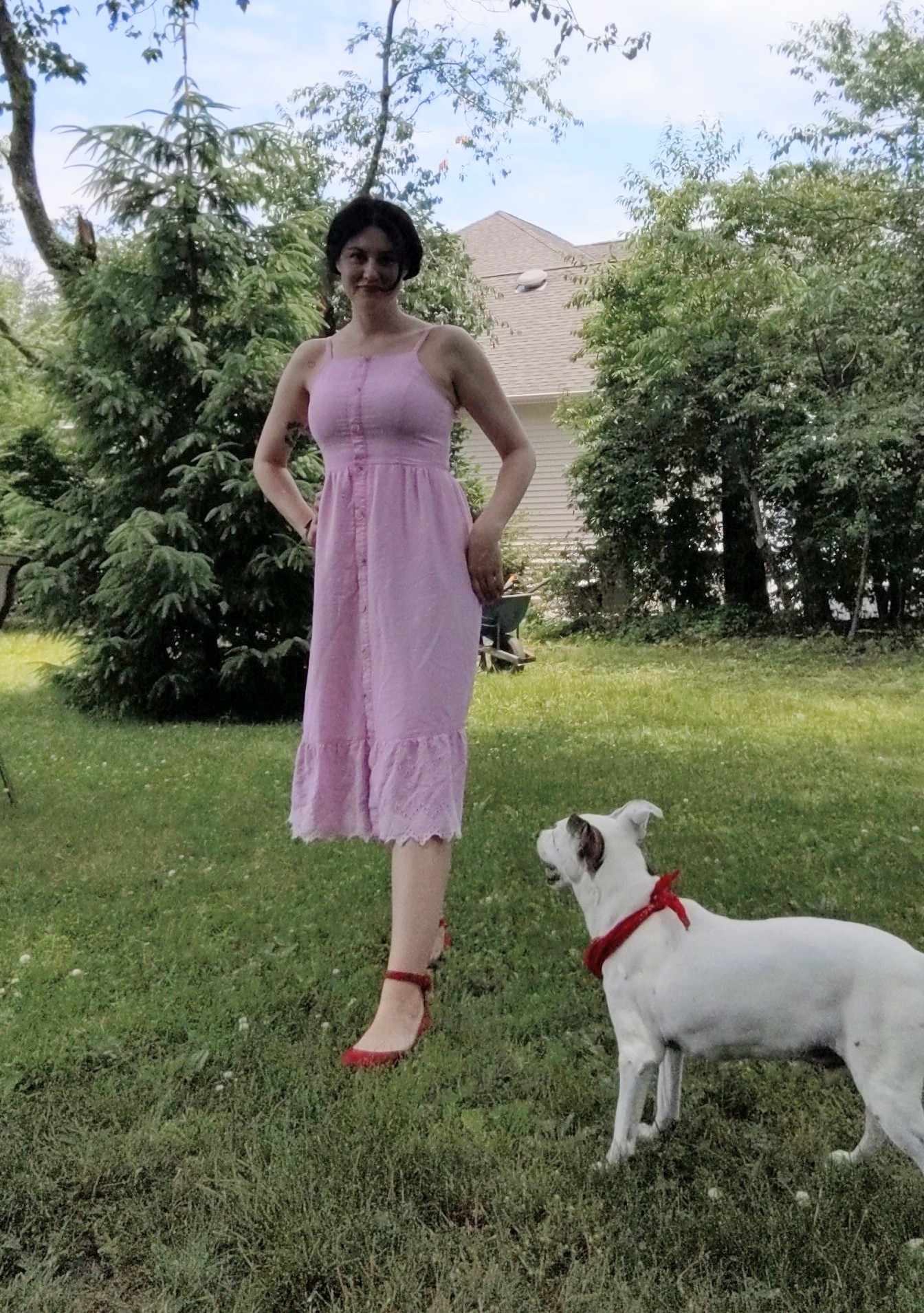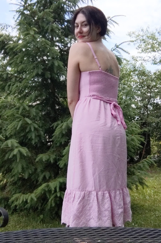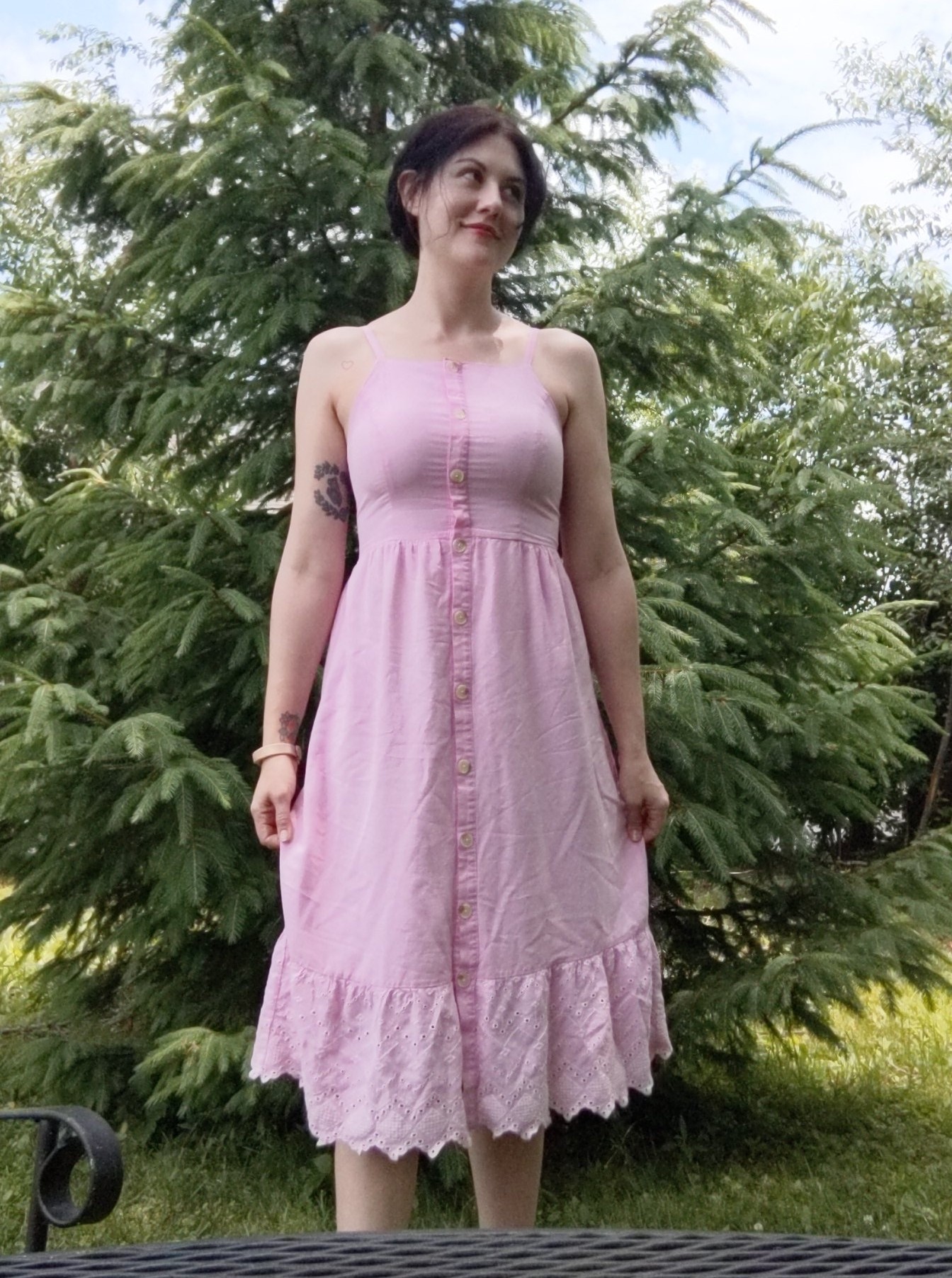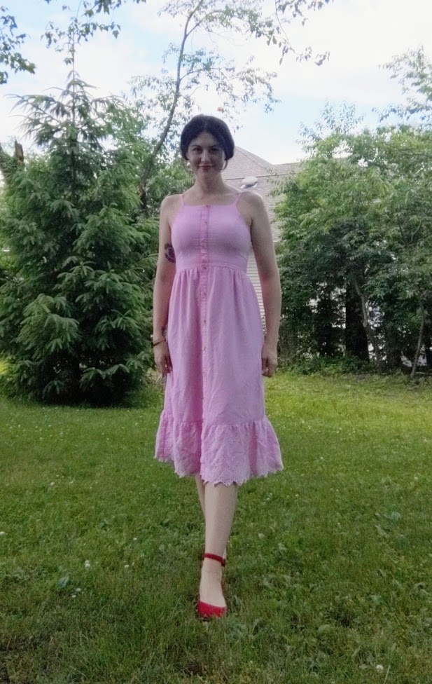 I do kind of wish that the pink had stayed more vibrant, but I am glad the dress isn’t so bland anymore! I did my usual photo-shoot in the backyard. I have to figure out how to get a longer timer for the camera, because so far my phone only gives me 3 seconds from pressing the button to running into place to pose. Hence why the “after” pics often look haphazard!