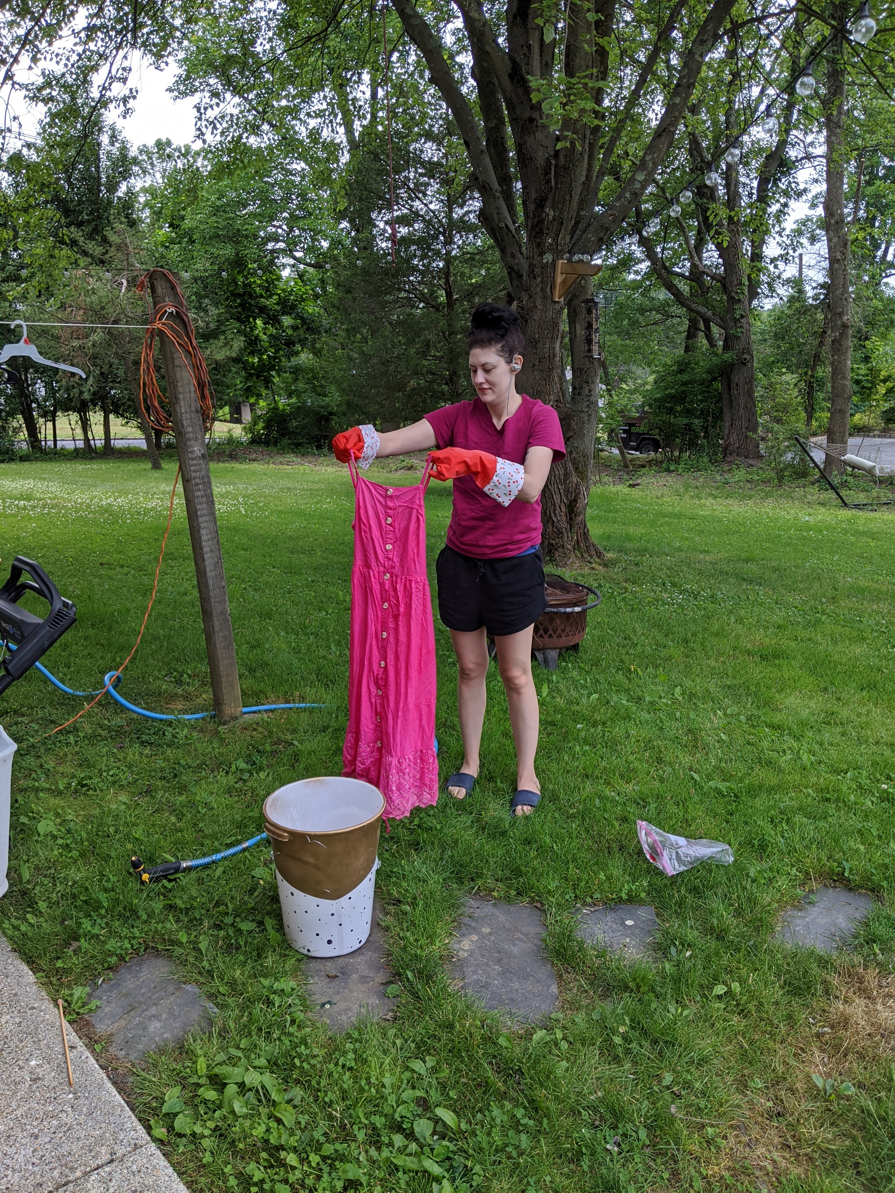 The next day I took the dress out of the bag, and was pleased to see how vibrant the color was. In case you’re thinking, “ew, why is she wearing the same outfit from yesterday?” I will point out that I started dyeing the dress whilst in my pajamas, and was still wearing them when I woke up the next day to rinse the dress. So. There ya go.