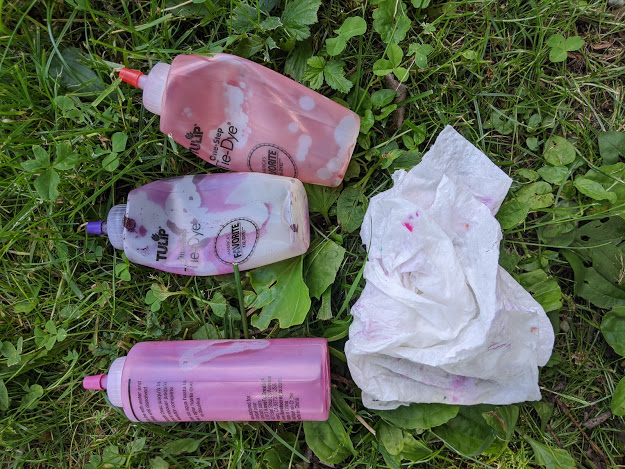 I’ve had this tie-dye colorant for literally a whole year, because I tie-dyed some shirts last summer, but the dye is still surprisingly usable. In the interest of using up the stash, I decided to blend all the rosy toned colors I had and just see what happens!