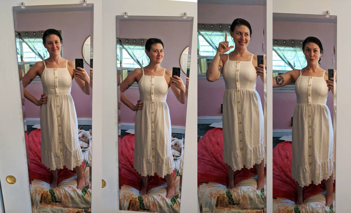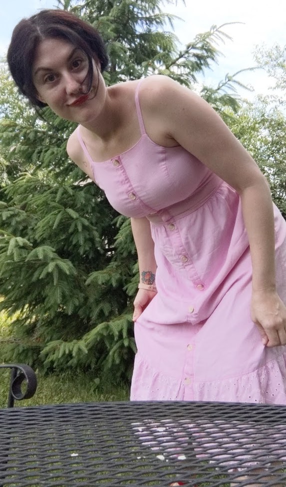 My little sister found this dress at one of the Salvation Army’s in New Orleans, but it is originally from Old Navy. 🚨SOAPBOX ALERT🚨 Now I know that Old Navy, and it’s parent company GAP, is a part of the “fast-fashion” problem, but we didn’t buy this garment off the rack and are salvaging it from the landfills, so I’m okay with owning it. Fast Fashion, if you don’t know, is the cheapening of clothing construction by using shoddy fabrics, rushed production, and harmful dyes and chemicals so that it can reach stores quicker. The result is that the turn around time for inventory is so quick that a store will likely have an entirely new inventory within a matter of weeks. The problem with that is that the clothes fall apart fast, which means the businesses have planned obsolescence so that we the consumers will buy and replace our clothes more quickly, leading to more discarded clothing in landfills. And it’s destroying the planet. Capitalism, am I right? Anyway, you can read more about Fast Fashion here: https://www.nytimes.com/2019/09/03/books/review/how-fast-fashion-is-destroying-the-planet.html