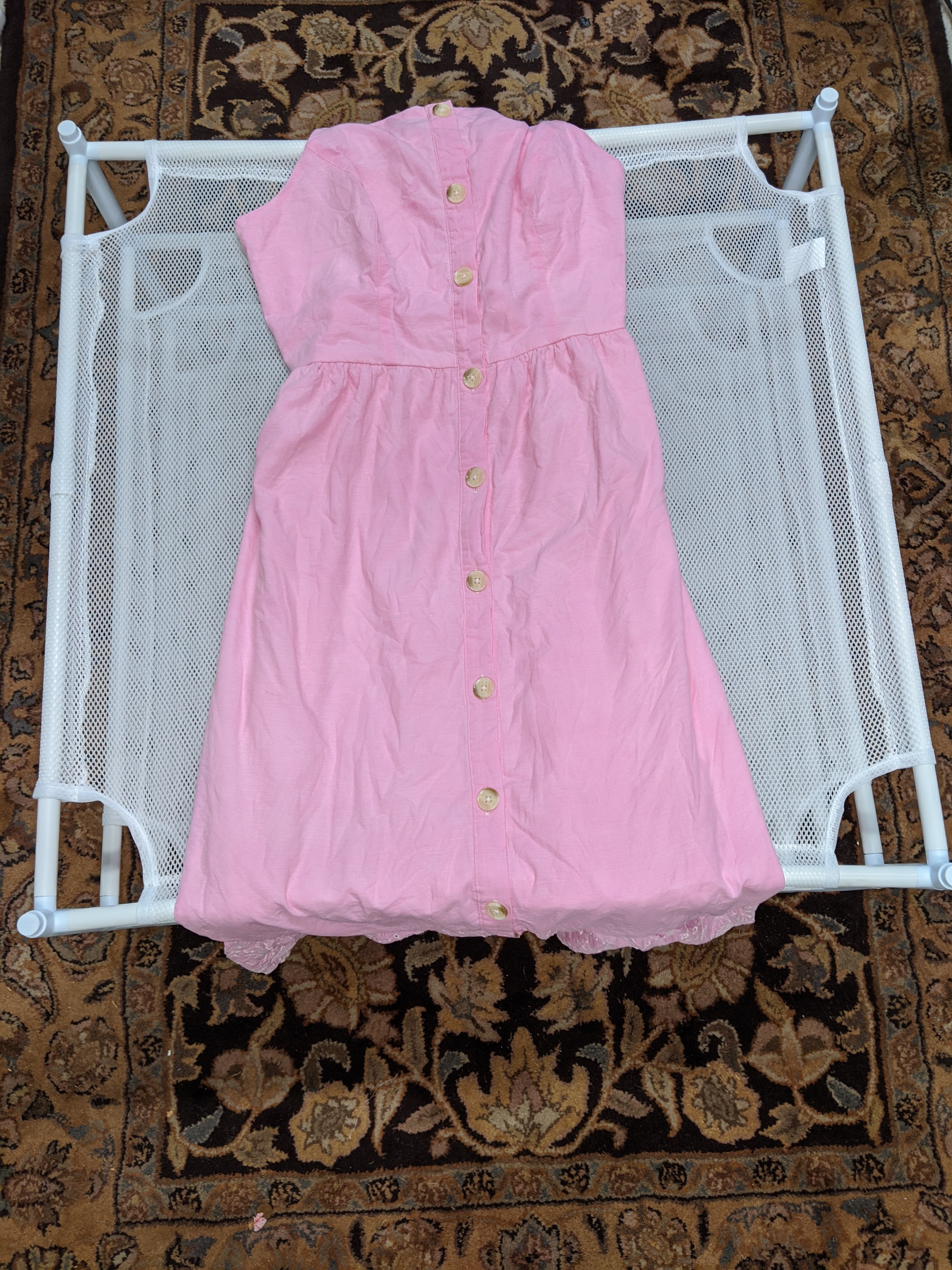 I’ve said it before that white washes me out, so what better way to update this dress than to change up the color? You can see behind me in the pictures that my bedroom is a gradient of pinks, even though I am a grown lady-woman. It’s because pink is the color of joy and laughter! We have phrases like, “tickled pink” and “rosey-colored glasses” for a reason, and I just feel good in a pink setting.