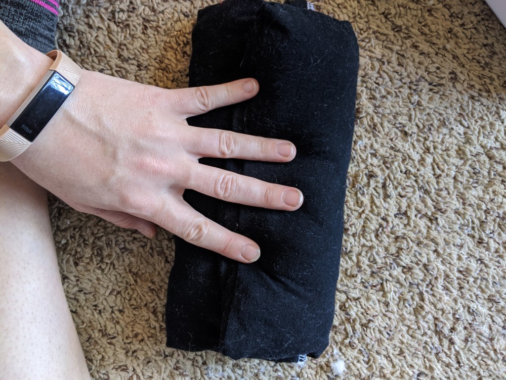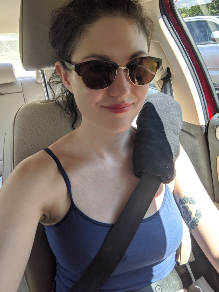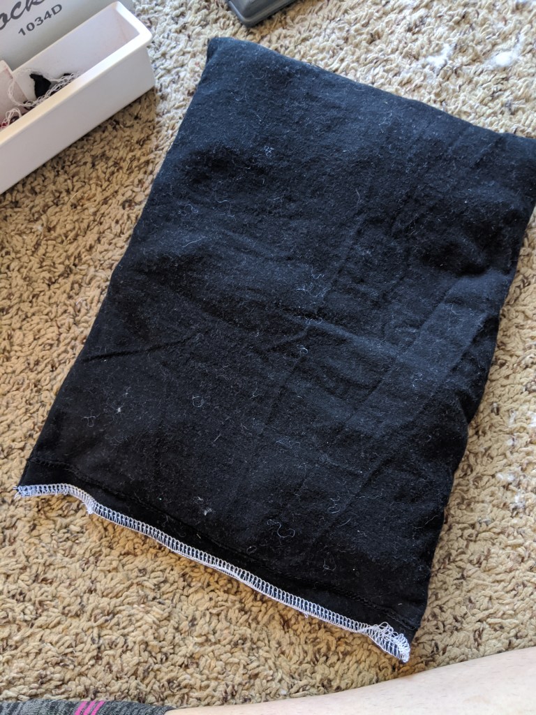 This refashion is taking a different direction, as it will *not* be made into something wearable. I noticed recently on a cross-country road trip that I wear my seat belt under my armpit most of the time because it slices into my neck (not safe, I know). However, after 20+ hours of driving, it had begun to slice into my armpit as well. I decided I needed one of those soft pad thingies that make the seat belt more bearable. I’m calling it a seat belt koozie for lack of a better word!