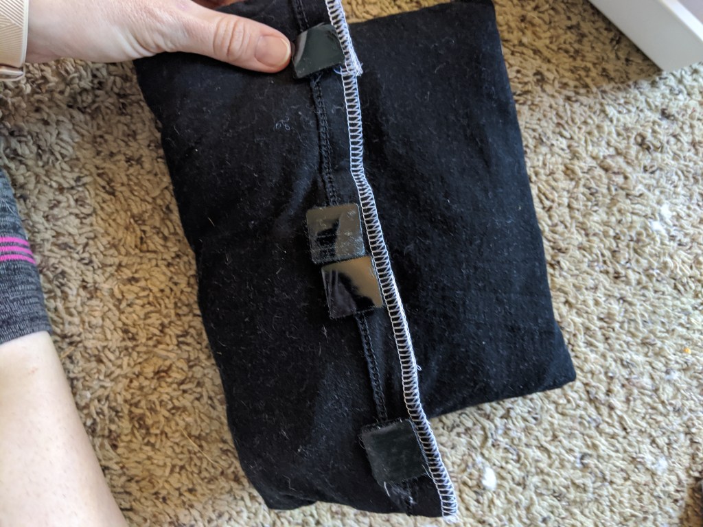 Next, I folded it in thirds and stuck on some velcro dots. These are self-adhesive, but I have found that they can melt off in the heat, so I also tacked them down for reinforcement.