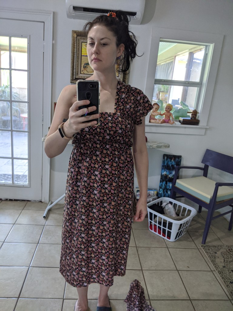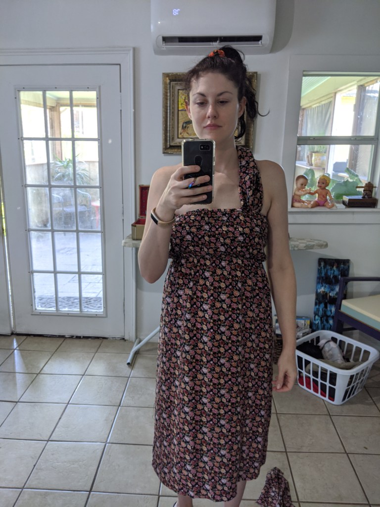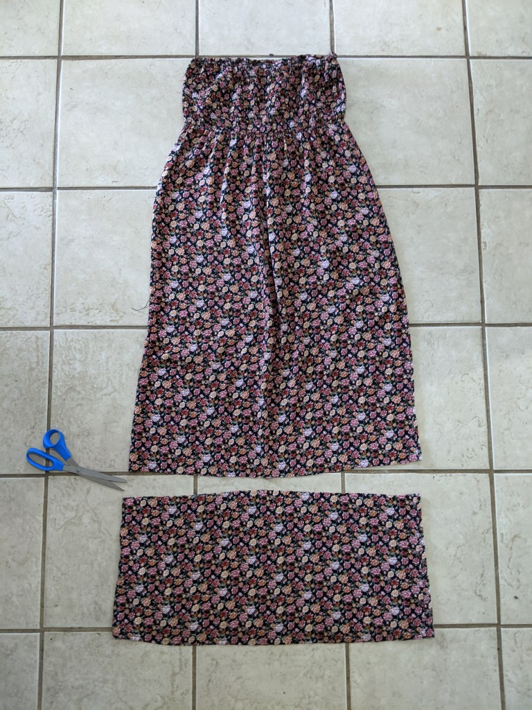 I’m totally fine with strapless things on other people, but maybe working with kids who tug on your clothes to ask a question has finally affected me, because my immediate worry is that some way, somehow, my top is going to get pulled down. I need sleeves, or straps at the very least, and making some would also help address the length! I like maxi dresses, but the fabric of this dress is not very stretchy, and I have a long stride.