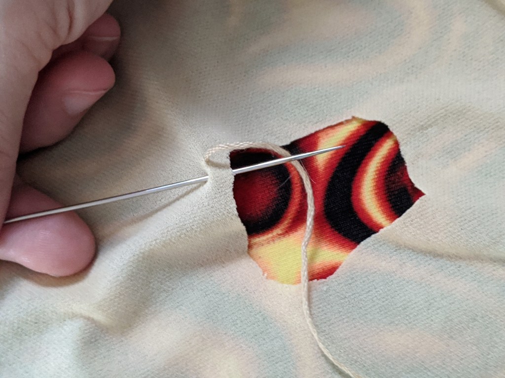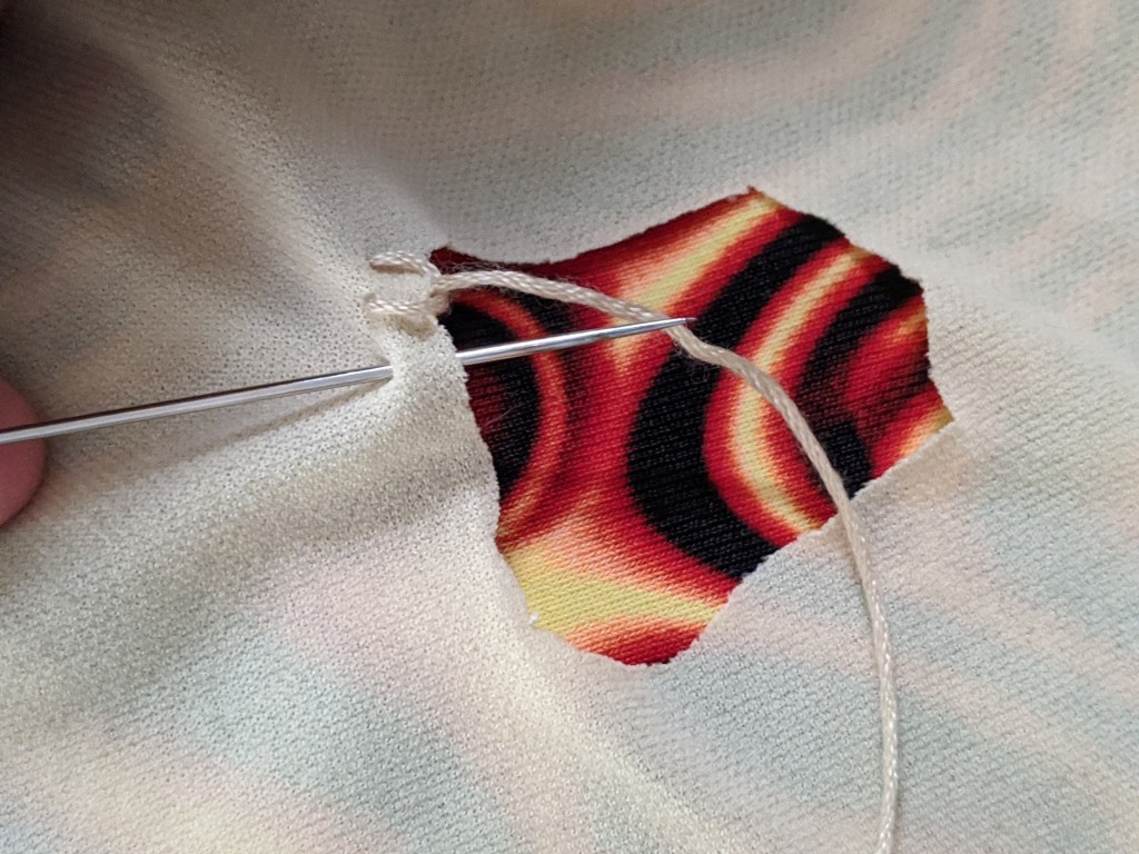 However, since the suit is 21-30 years old, the lining has a little wear and tear. The hole got a little bigger once I initially started sewing on it, so I had to cut the tear to be more even and start again. Here’s what I’m working with.