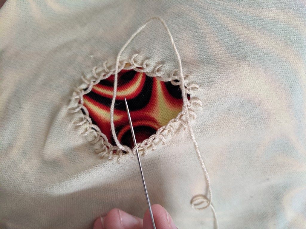 Darning, in case you haven’t heard, is mending a hole with hand-stitching (or these days, maybe machine stitching). To darn a hole, you can either weave across it, or crochet around it. Guess which one’s easier.