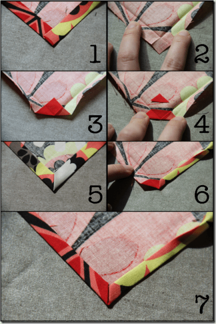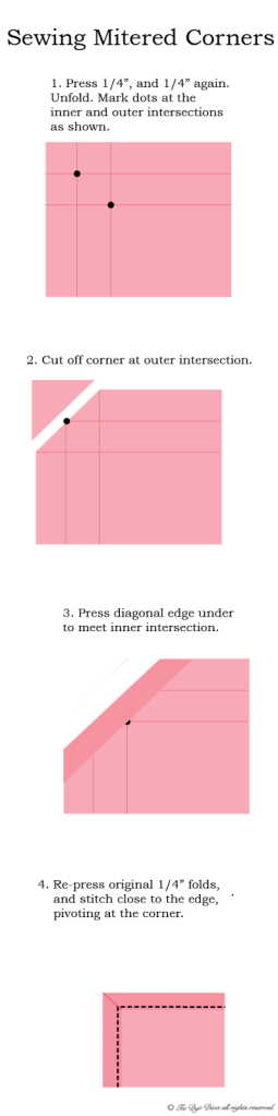 Where the slits were required a bit more creative ironing, because I didn’t want any of the edges to show the fabric doubled over itself. You have to make mitered edges to give it a smooth look. I found 2 handy images to help illustrate what to do to make a mitered edge, in case you’re wondering: