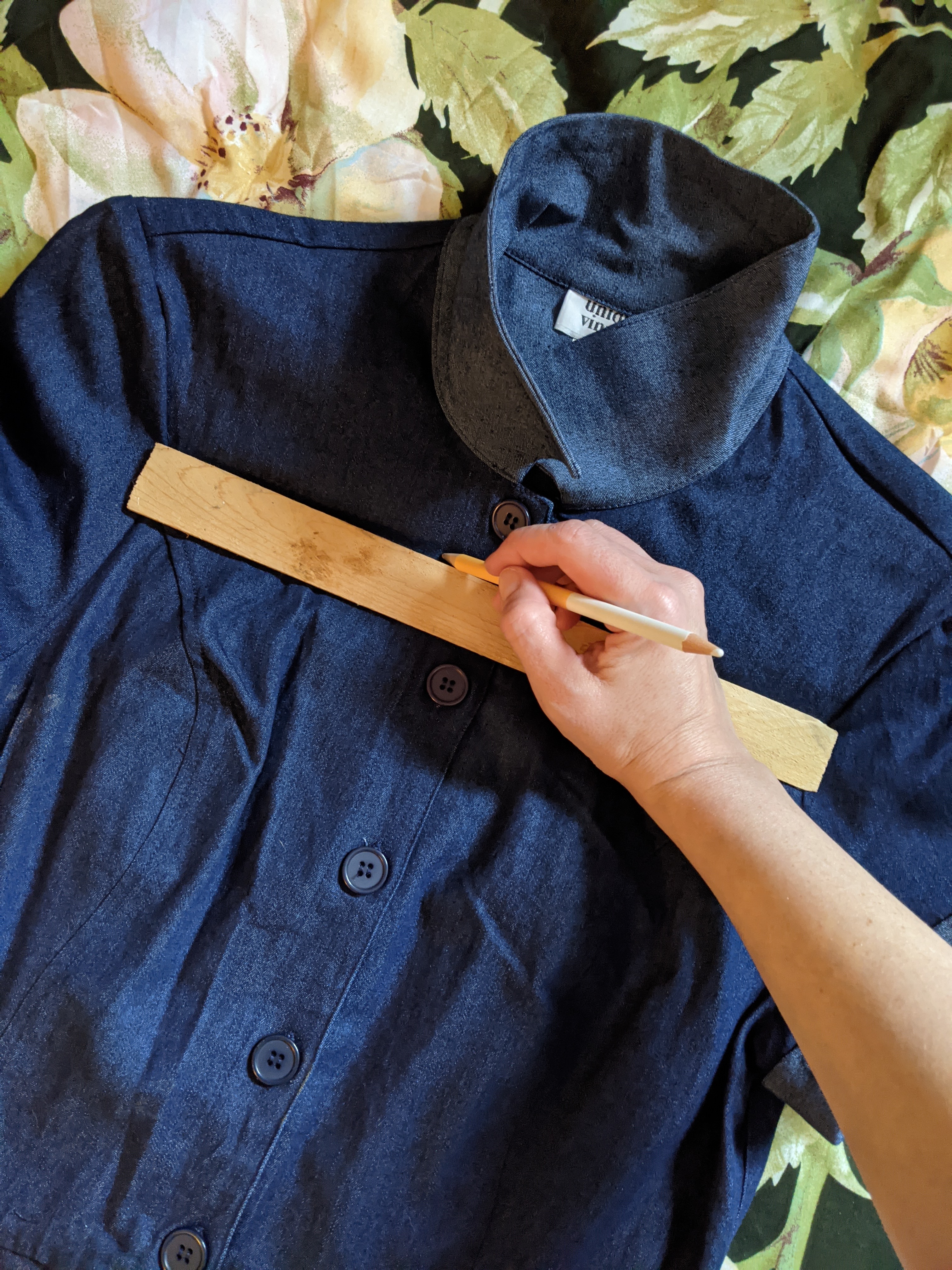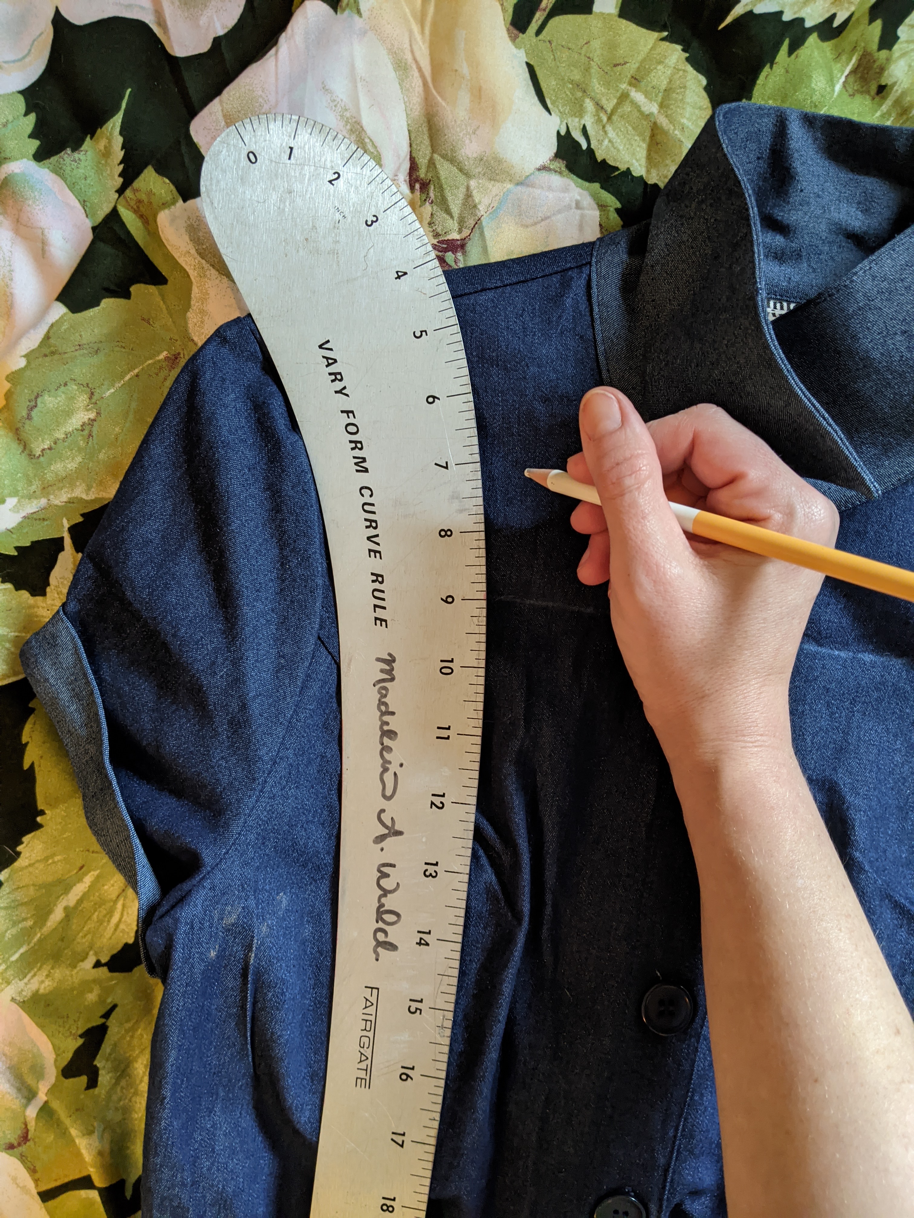 First step: get rid of the collar. I’m using a light colored pencil, a straight edge, and a vary form curve to mark even lines for where I want the new neckline and armscye to be.