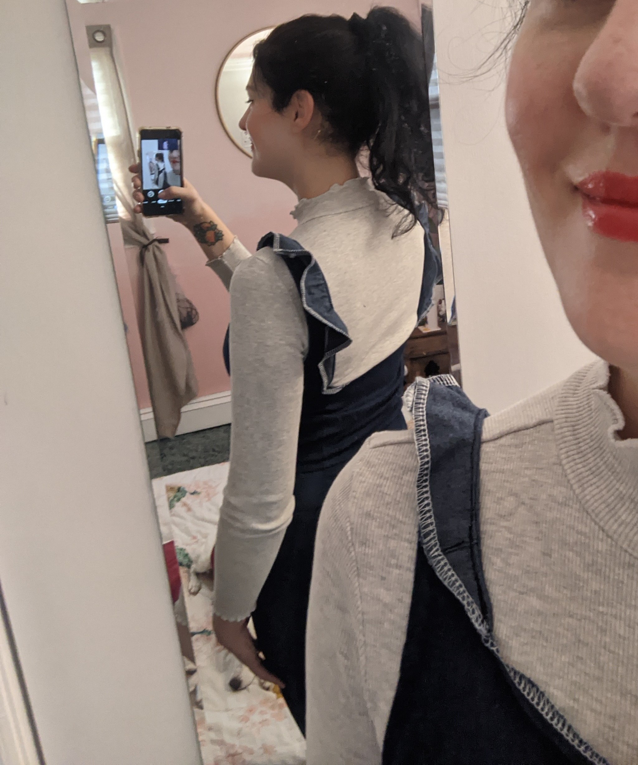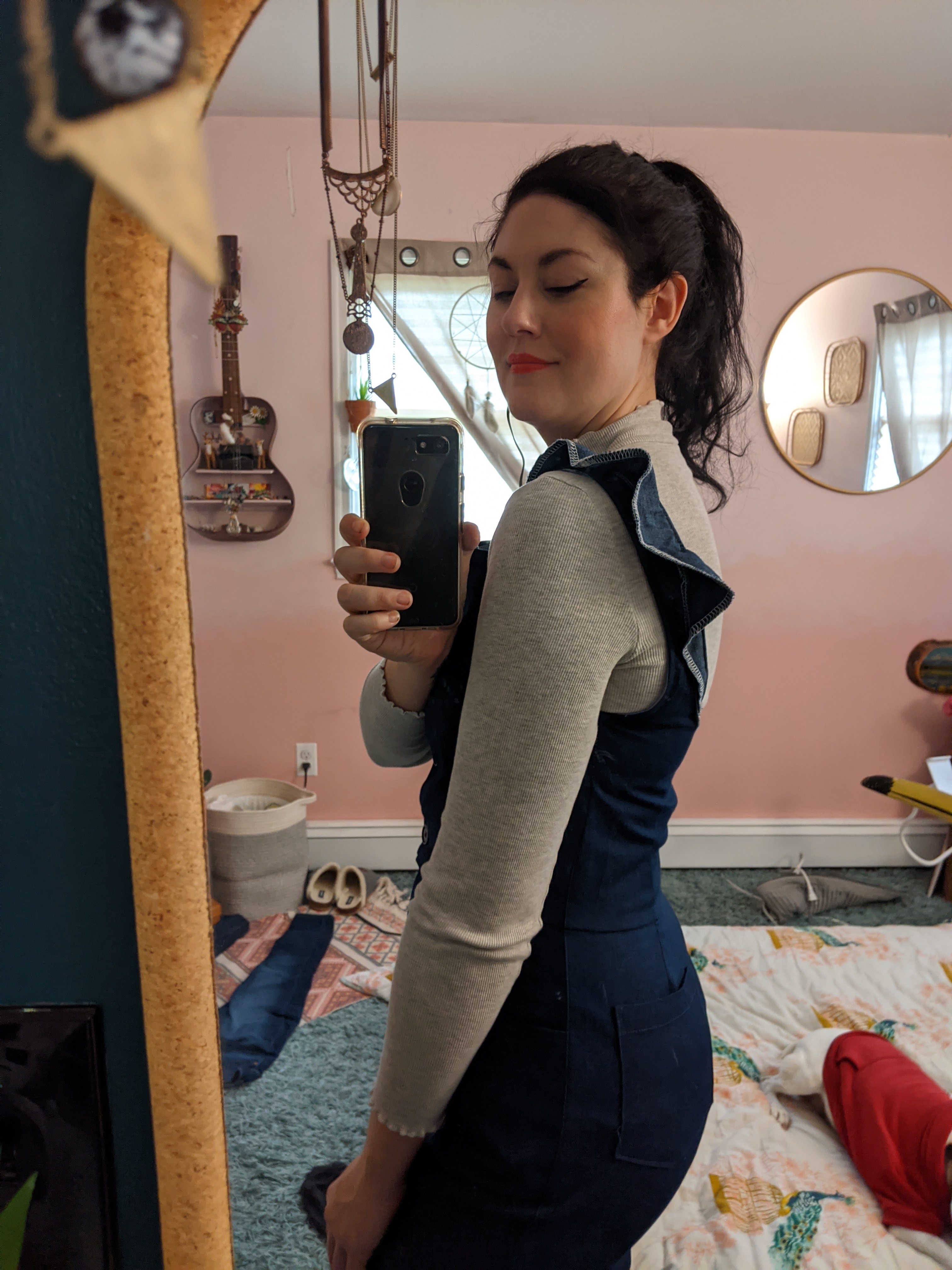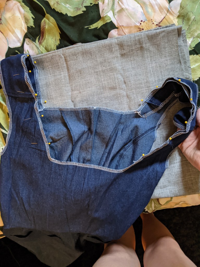 Apparently I didn’t get a picture after all the edges were serged, but I promise it was fire. It looked like a tank top version of coveralls. As whenever you remove sleeves, there will be a gap of about an inch under each armpit. Simply pin the front and back right sides together, and sew down to the waist seam, gradually decreasing as you go.