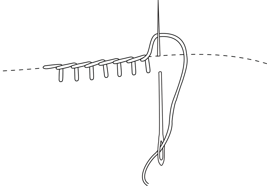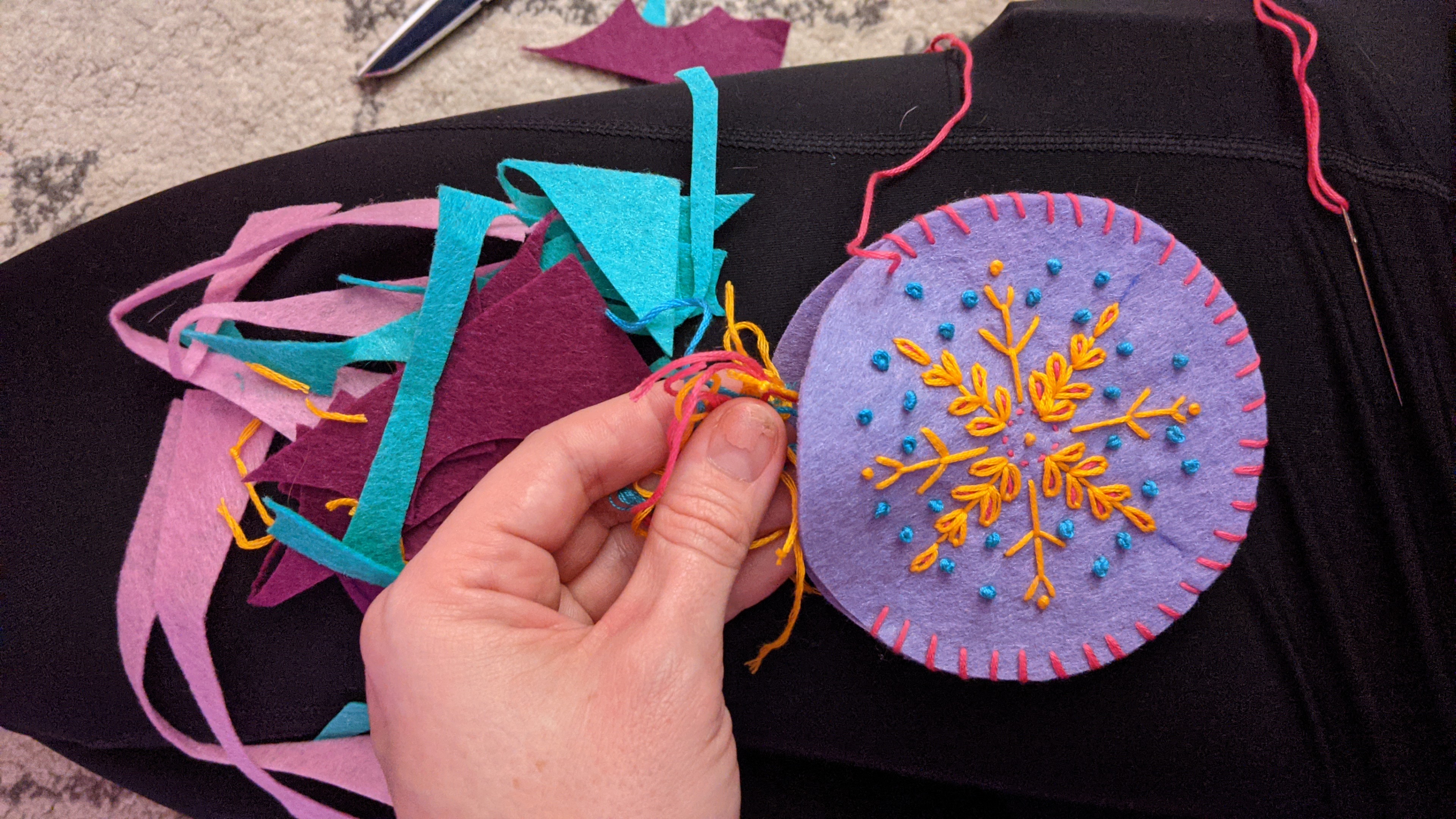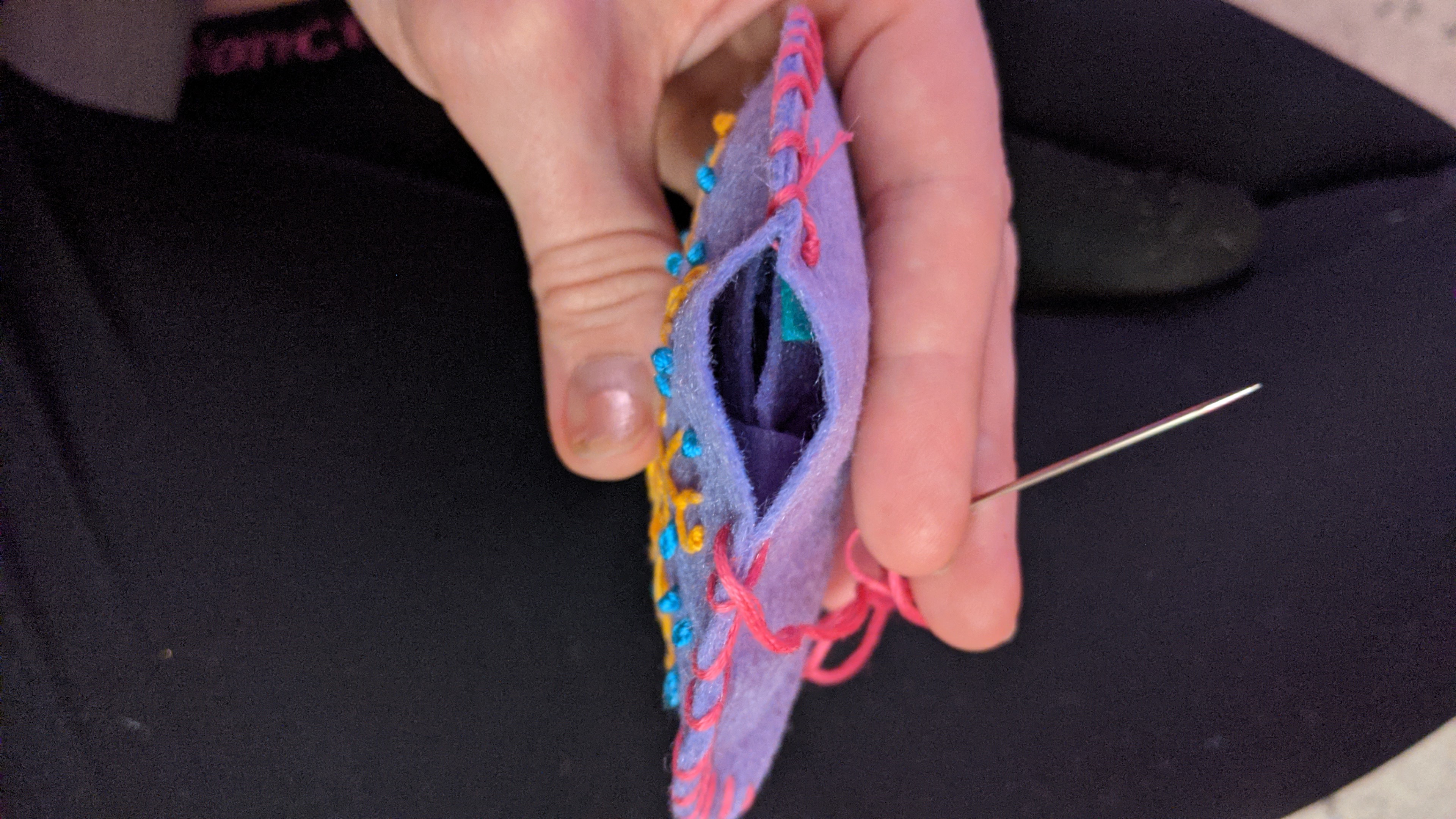 When I was satisfied that I’d done 3 “just one things,” I whip-stitched the front and back together with more of the pink thread. Here’s a whip stitch:
