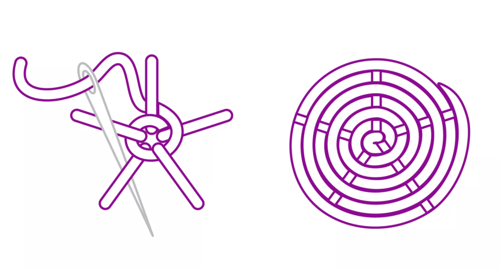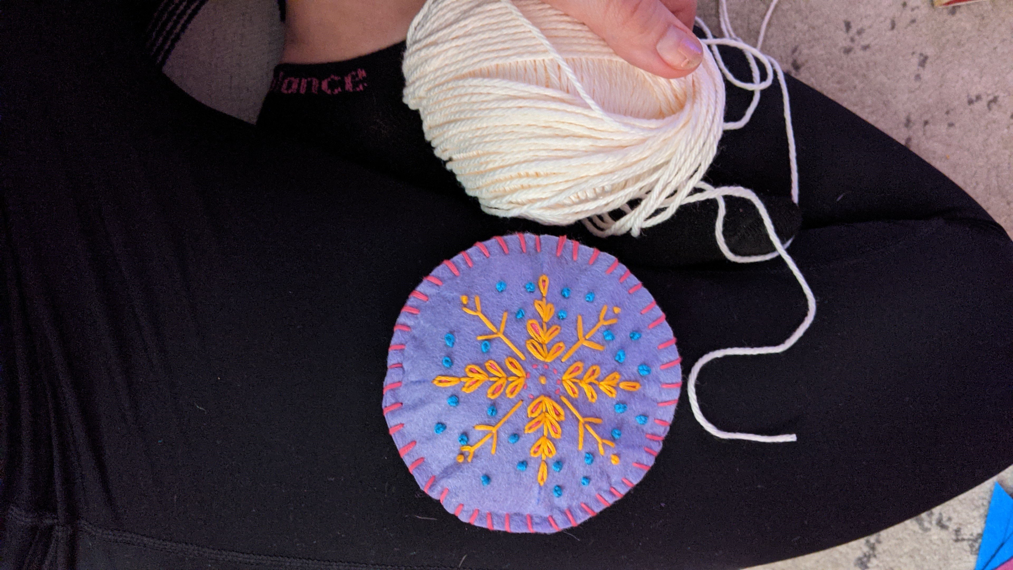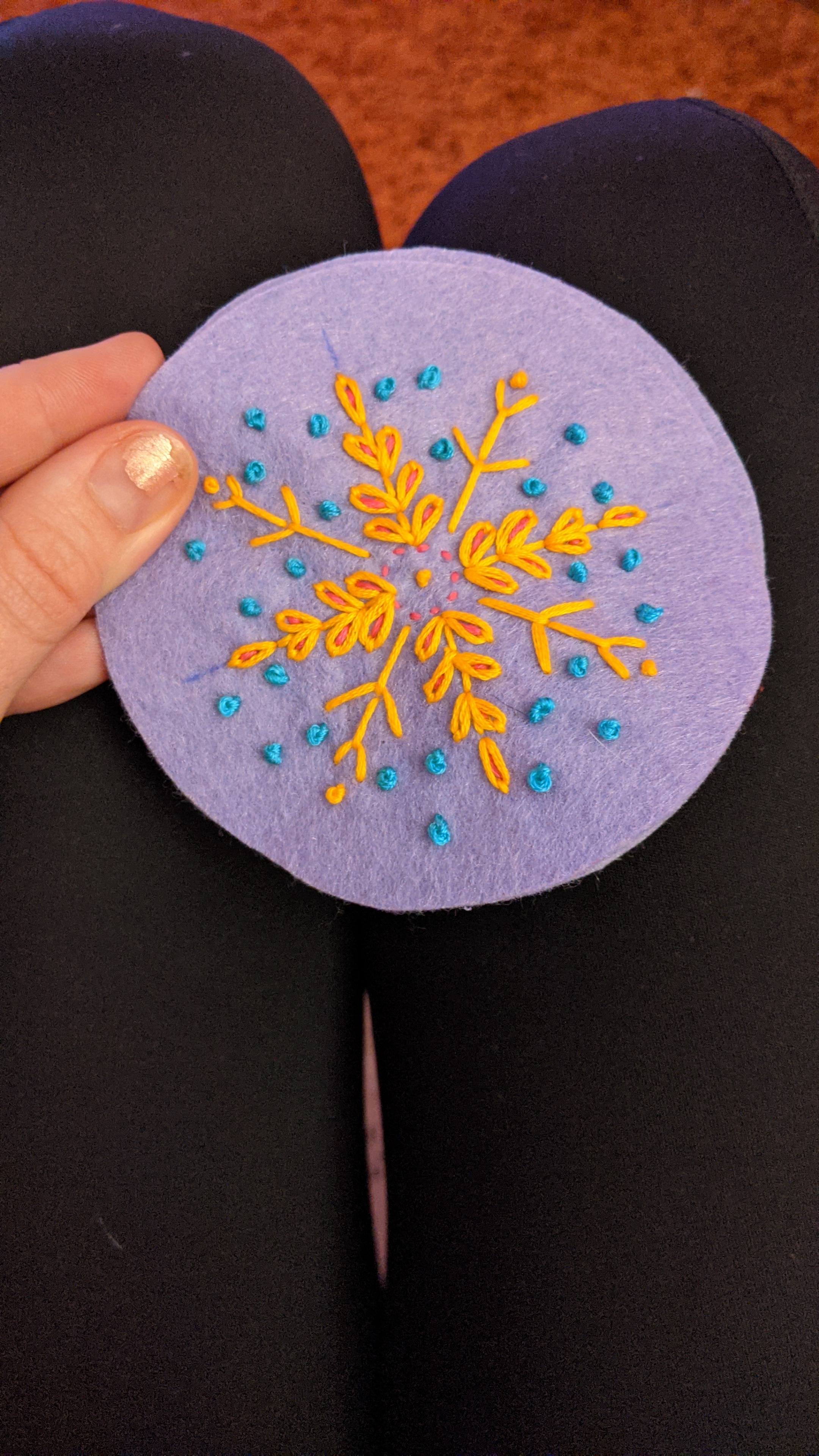 So step 1 was to mark out where I wanted the arms of the snowflake to go. Then, I did some Lazy Daisy stitches, like this: