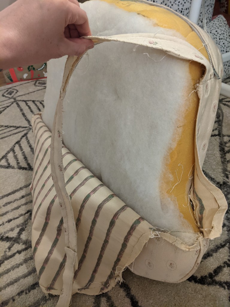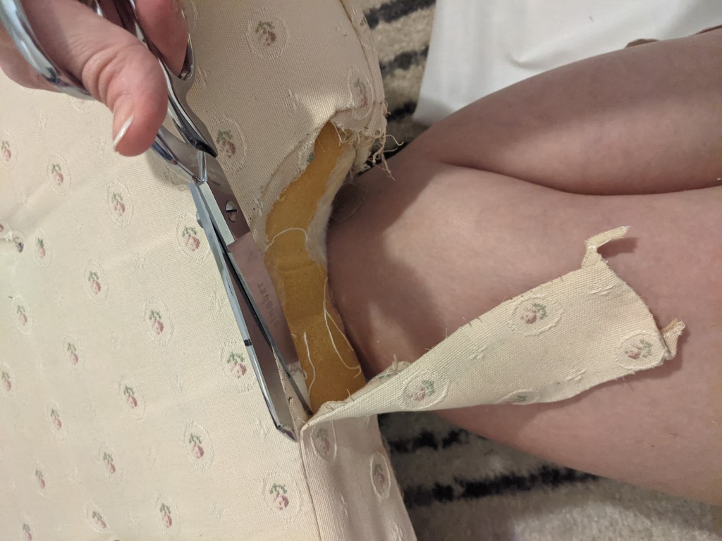 The first thing to do was remove the old fabric, which I did by cutting only the threads that held the seams together. That way, I could use the old fabric as a pattern for the new cover.