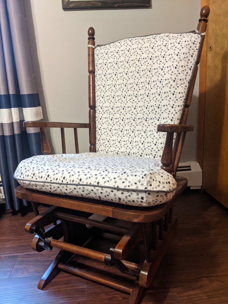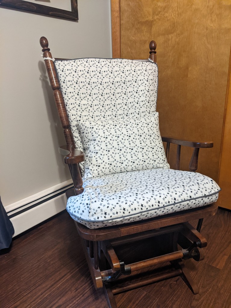 One of the things that Jen is excited about is rocking this new being in the family gliding chair. (I’d call it heirloom, but it’s only from the 80’s). I did not see it as a unified chair, so I only have the cushions to show you.