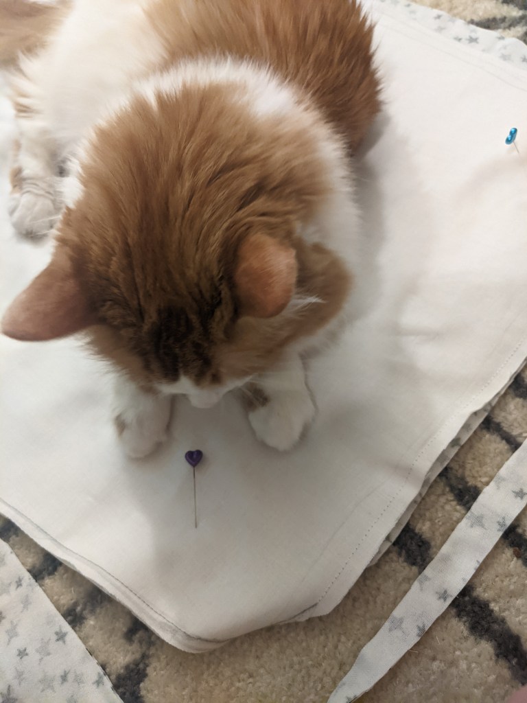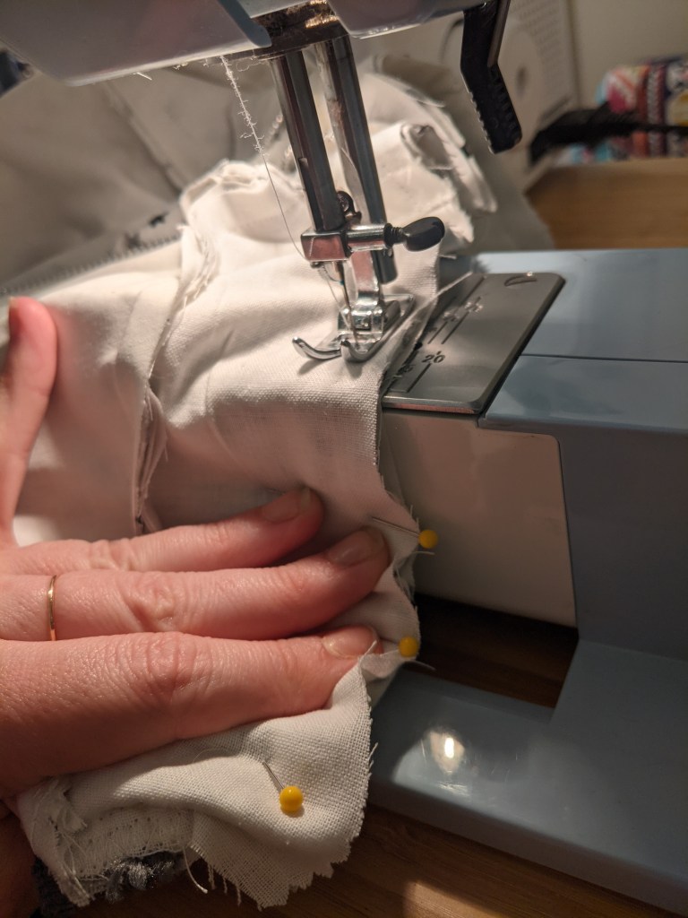 Wanting to avoid a wrinkle or ripping all those seams back out, I took the pins out and finagled the fabrics back into shape. One trick that I like to use when I have a lot going on under the needle is to remove the flat bed attachment, since that helps you go around curves (at least in my experience).
