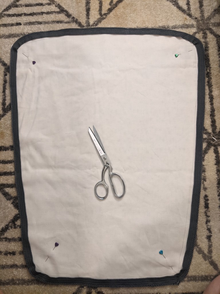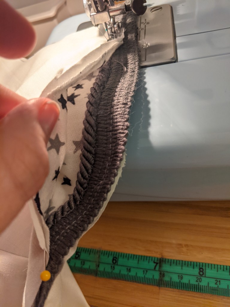 Once all the lining and new fabric cover pieces were cut out, it was time to reassemble the dang thang. As an added flourish, I placed some matching flanged piping cord (some rope with a 1/2 lip on it so you can sew it to stuff) between the outer fabric and the lining. To keep it from slipping and shifting around, I pinned and sewed it to the lining first.