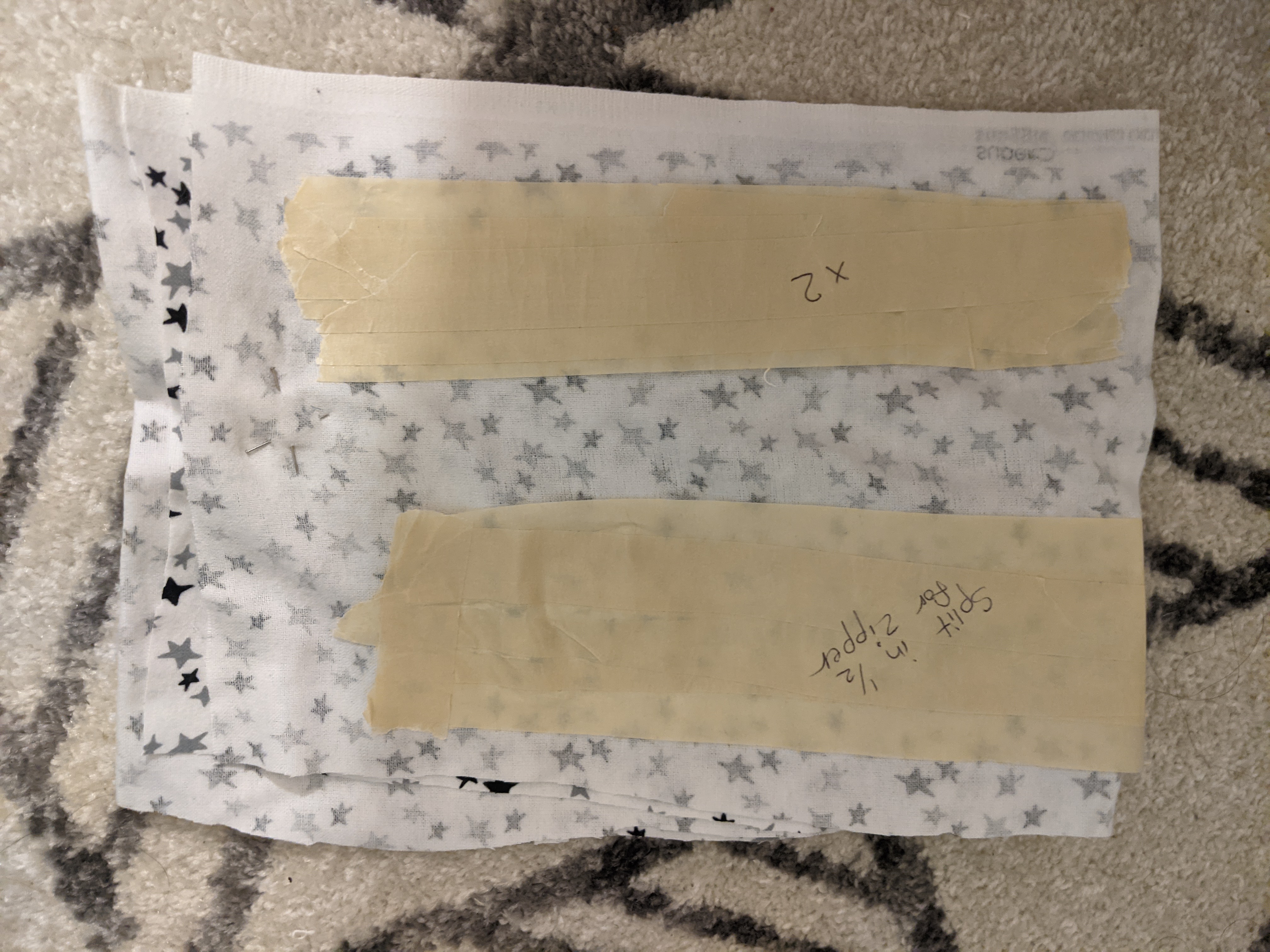 I then lost my mind apparently, and tried to make a pattern by tracing the whole thing in masking tape. This tape would then be laid out on the new fabric and I planned to add 1/2″ seam allowance. Below you can see what I was attempting with just the zipper and binding.