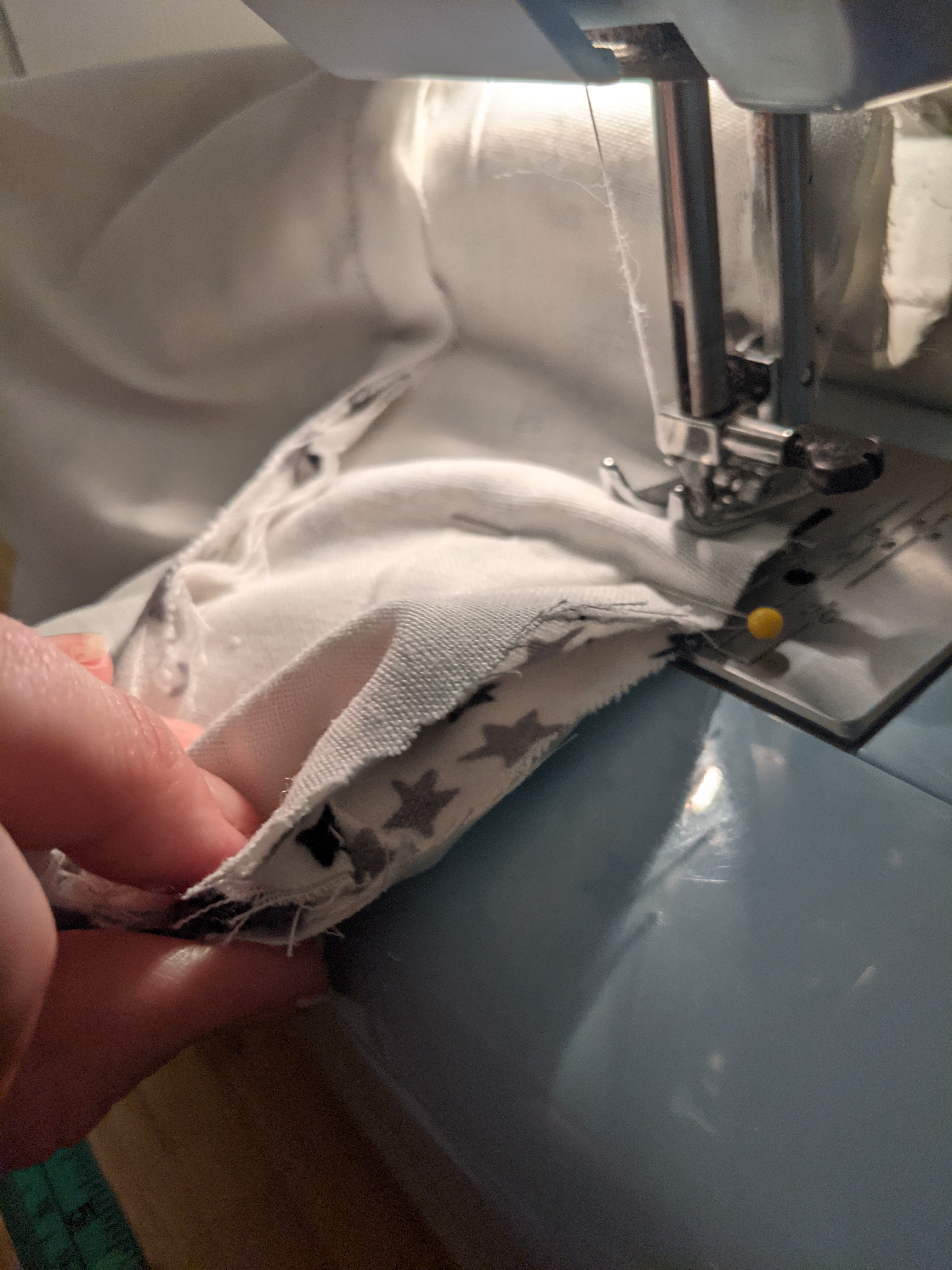 Wanting to avoid a wrinkle or ripping all those seams back out, I took the pins out and finagled the fabrics back into shape. One trick that I like to use when I have a lot going on under the needle is to remove the flat bed attachment, since that helps you go around curves (at least in my experience).