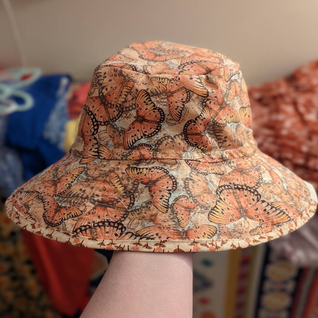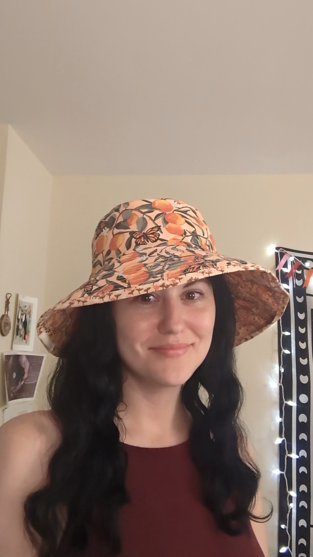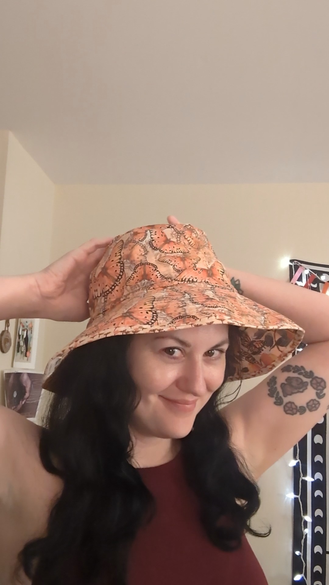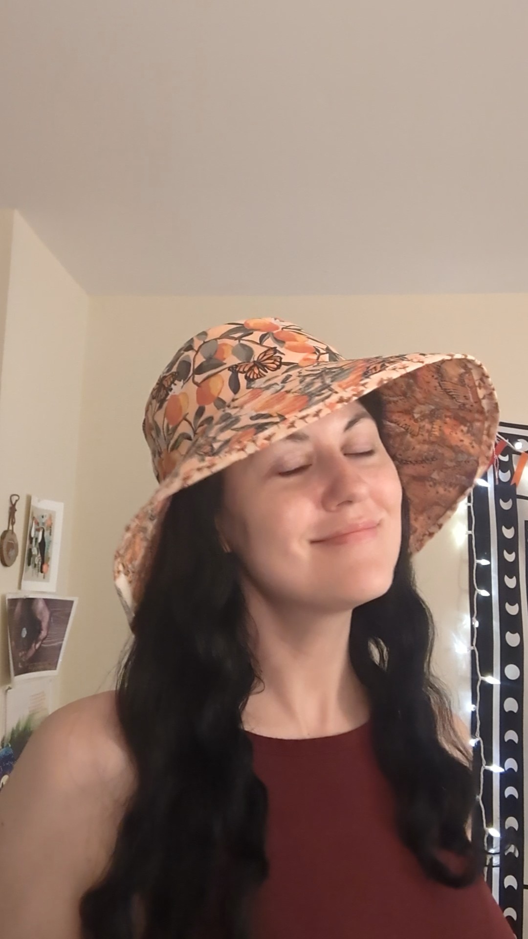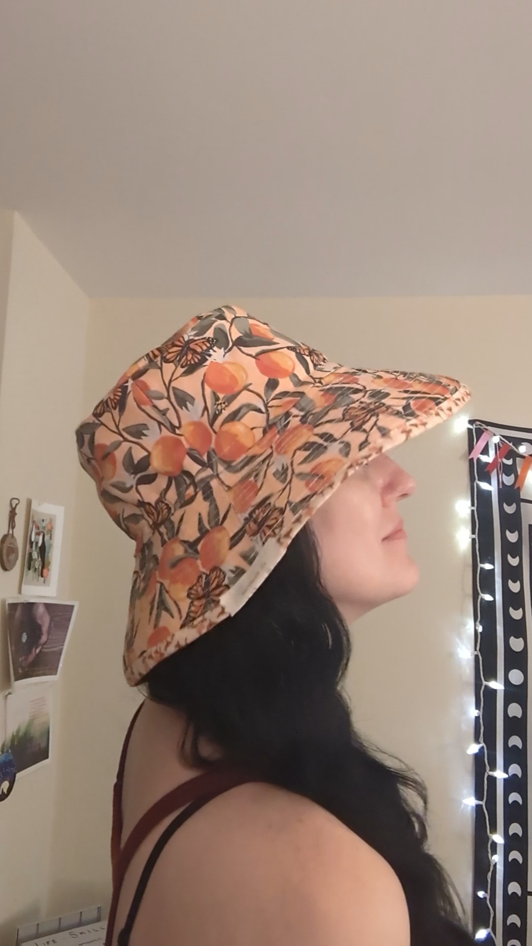 My pictures are quick and unedited, and done immediately after sewing (hence the string I didn’t notice until now on the butterfly side). The pics could definitely be staged better if I was trying to sell these or something, but this is the realness #nofilter. The hat itself is very comfortable to wear, not too loose or too tight, the brim doesn’t come down too far and obstruct your vision, and you could easily reduce the width of the brim if you needed to.
