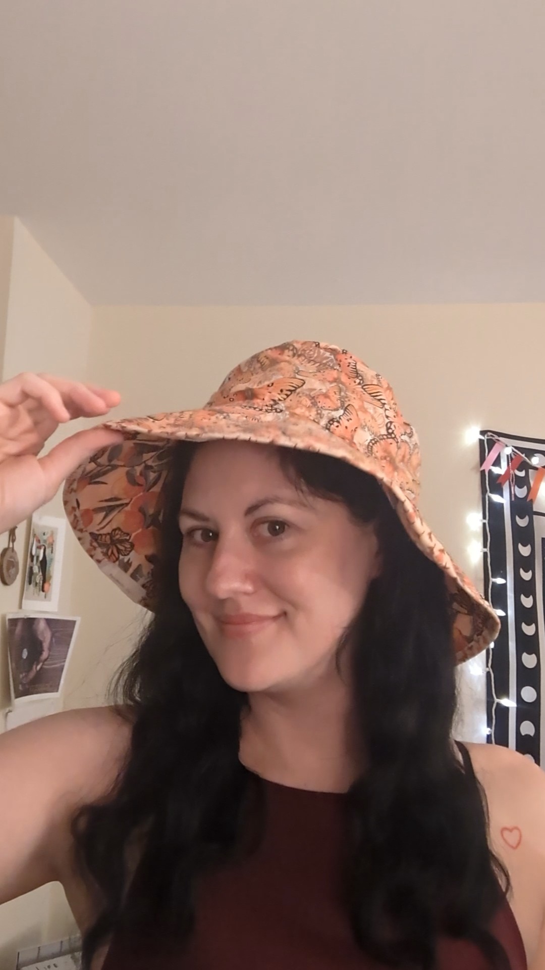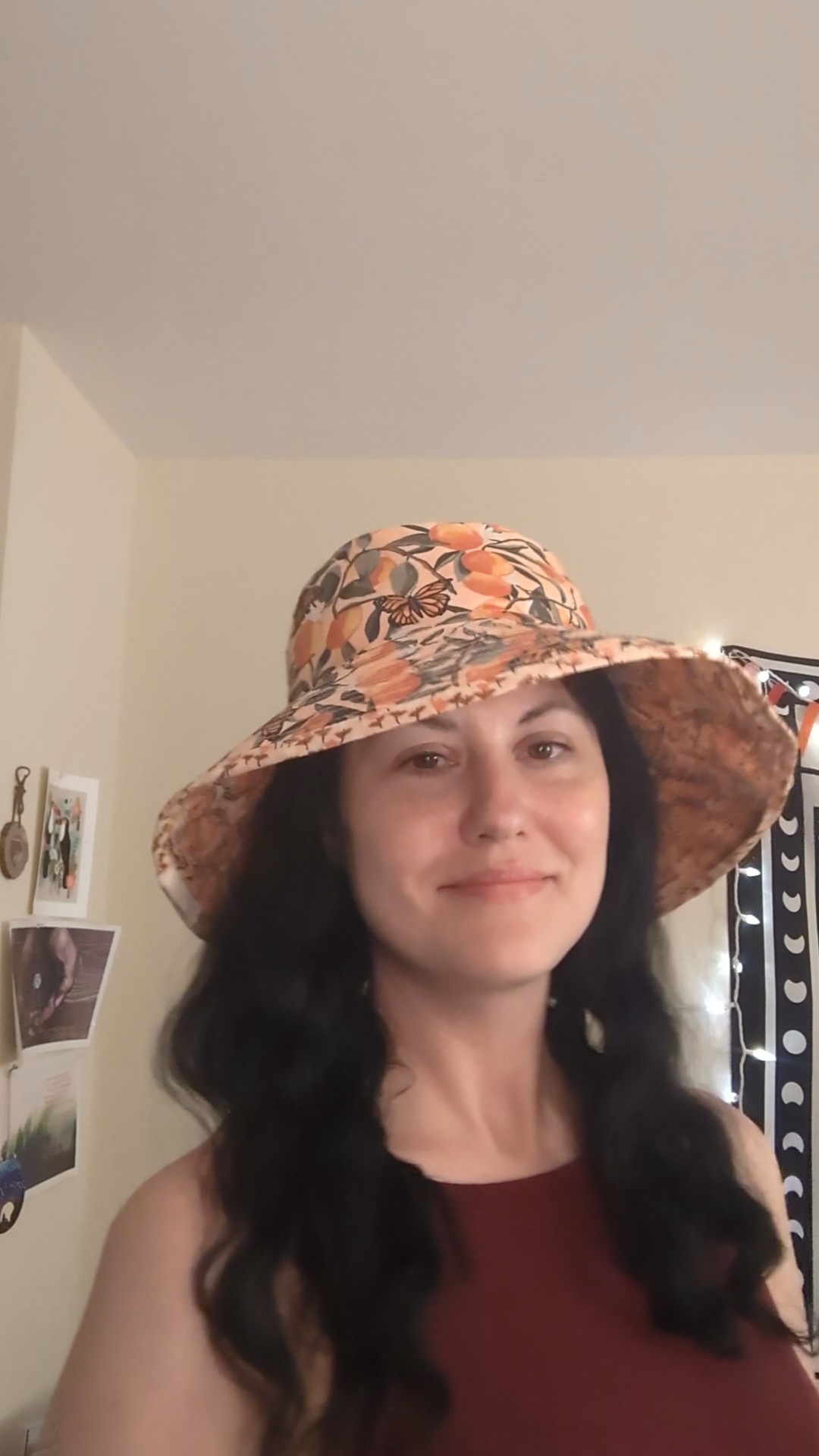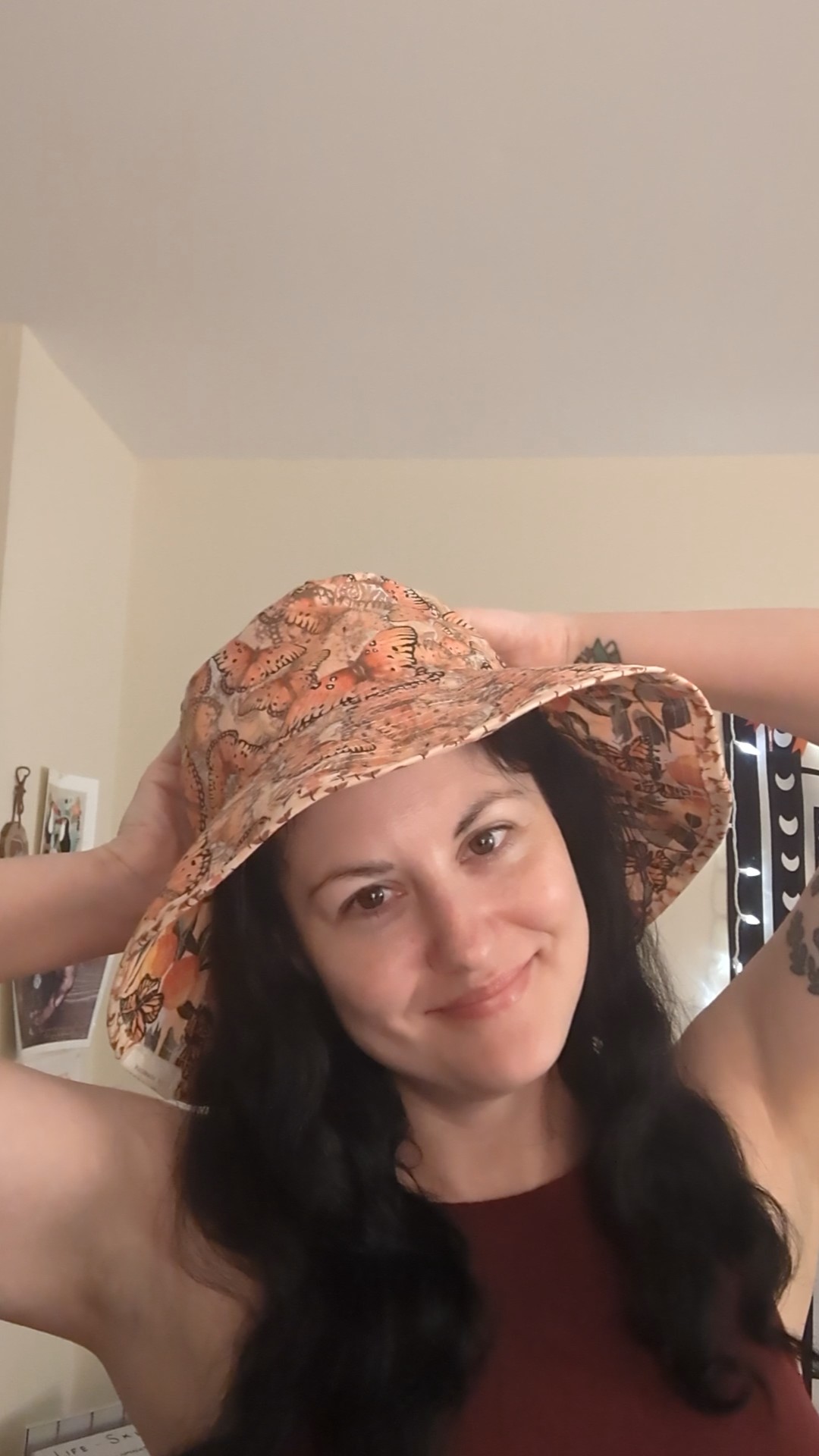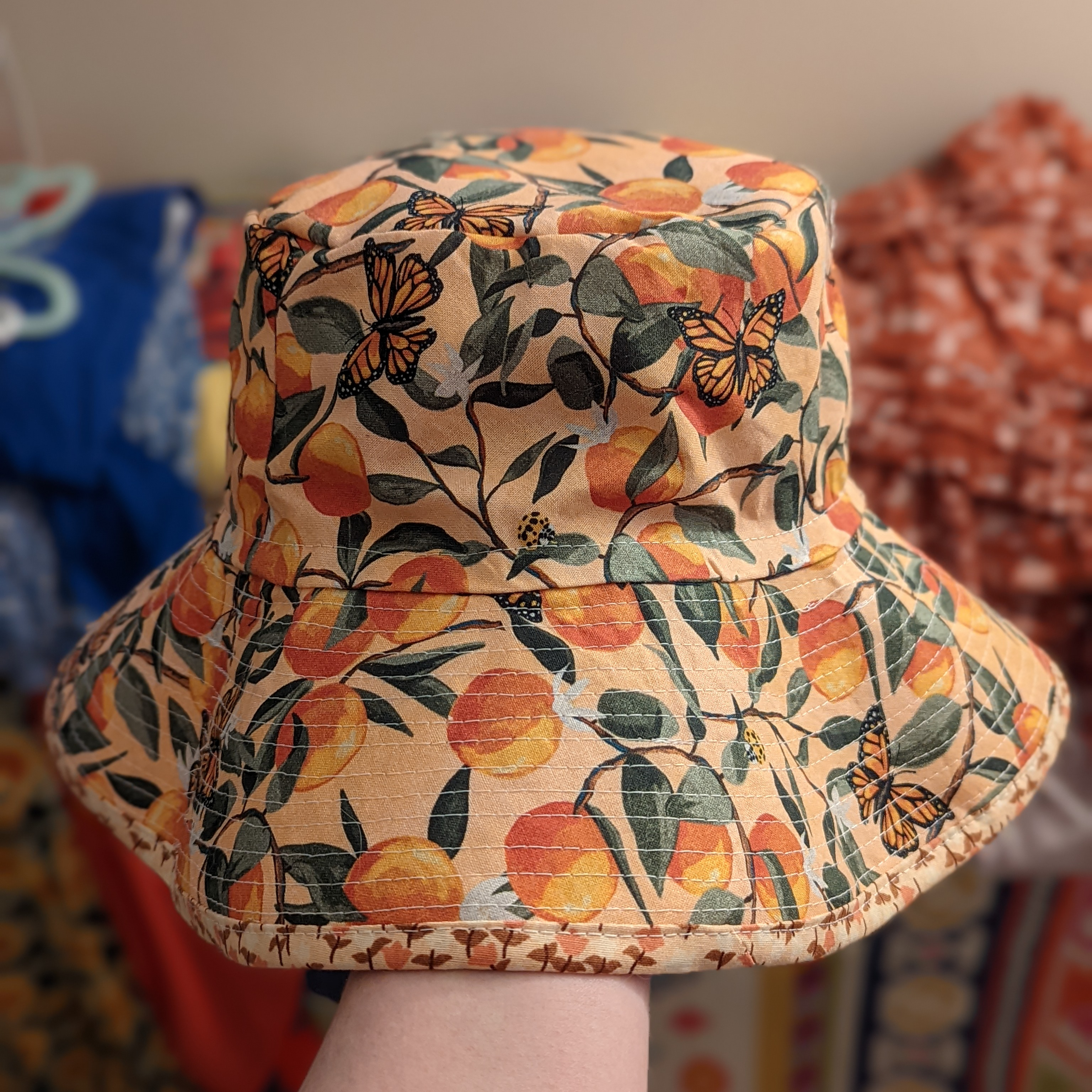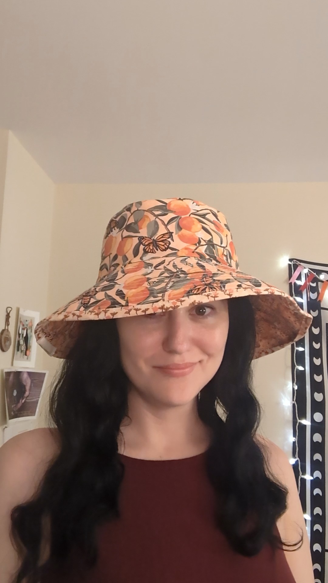 My pictures are quick and unedited, and done immediately after sewing (hence the string I didn’t notice until now on the butterfly side). The pics could definitely be staged better if I was trying to sell these or something, but this is the realness #nofilter. The hat itself is very comfortable to wear, not too loose or too tight, the brim doesn’t come down too far and obstruct your vision, and you could easily reduce the width of the brim if you needed to.