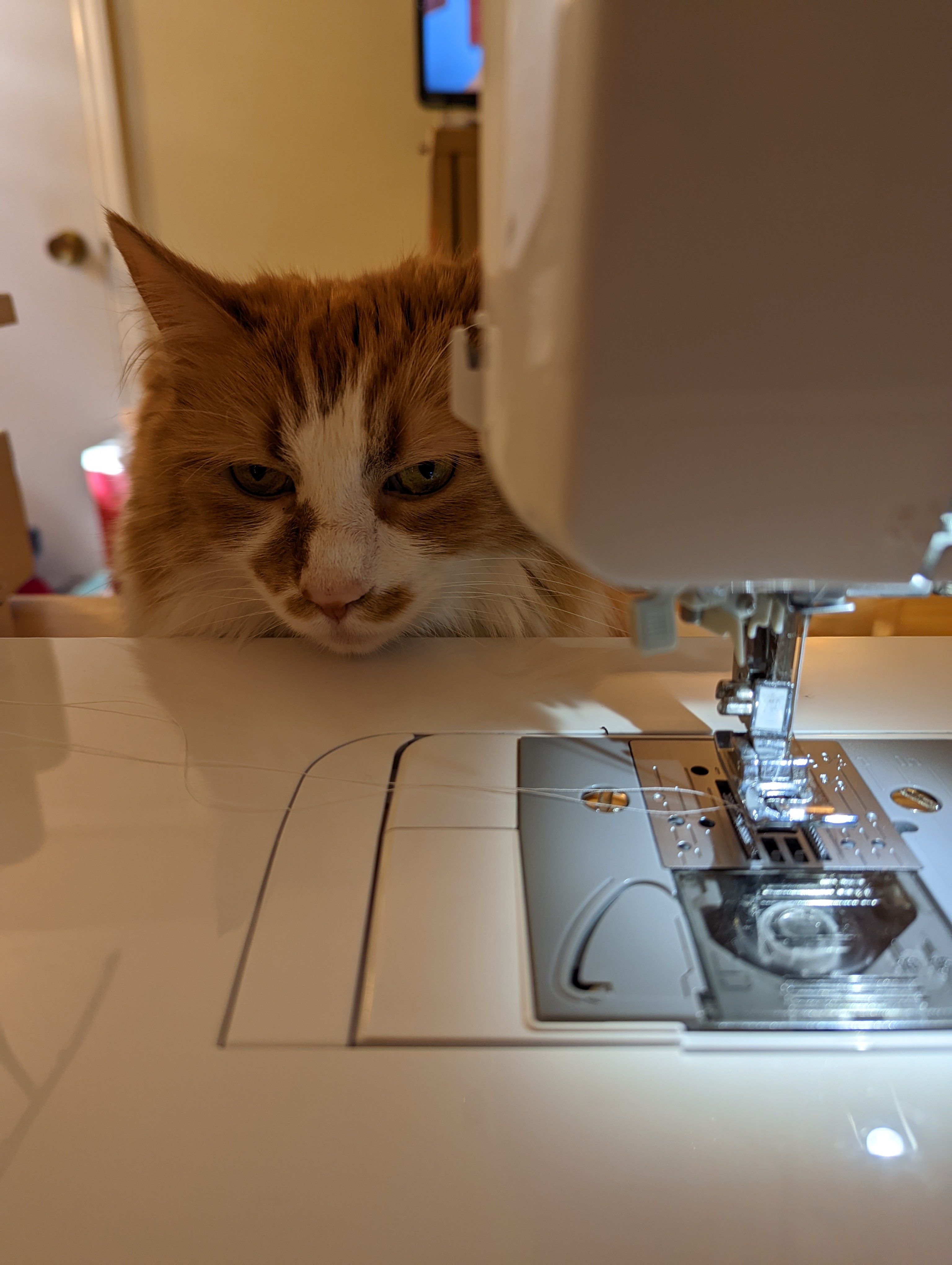 For some reason, I can’t find any of the pictures of me hunched over the sewing machine to assemble the dang thang, but just imagine you’re sewing on your machine while an orange and white kitten is pulling the pins out of the fabric, and swatting at the thread such that you have to restring the machine several times. She is also resting awfully close, and gets offended when the fabric inevitably touches her face.