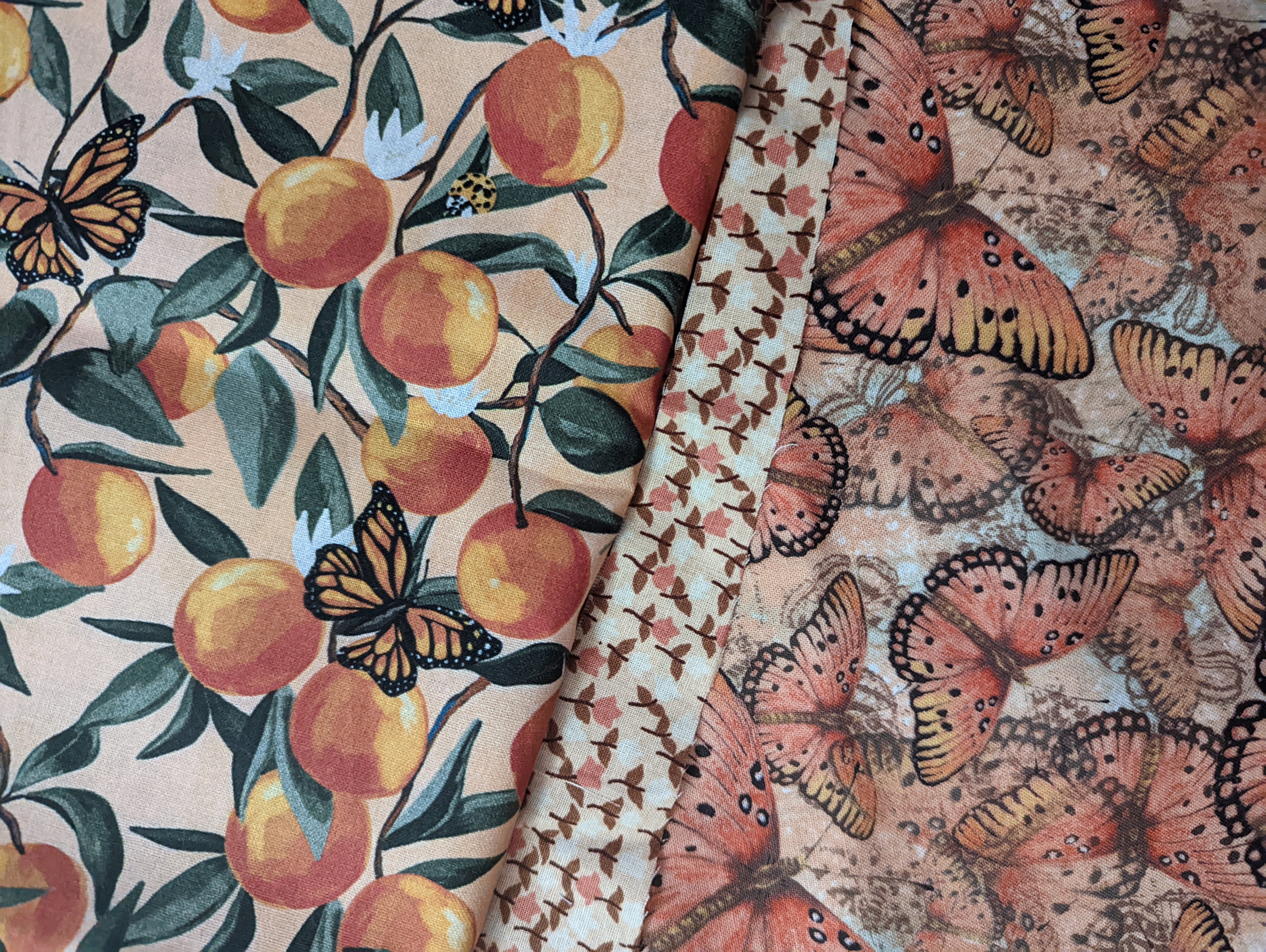 Of course, it wasn’t all bad. One of my students had a grandmother that owned a fabric shop, and once she retired, she donated a TON of fabric to me and the art teacher. Some small bits were these charming orange butterfly and peach prints. I love the warmth of the colors and could have made a ton of things with them, but I had only a yard of each, so I needed a nice, small project to use them on. I held on to the fabric for about 8 months before I got an idea.